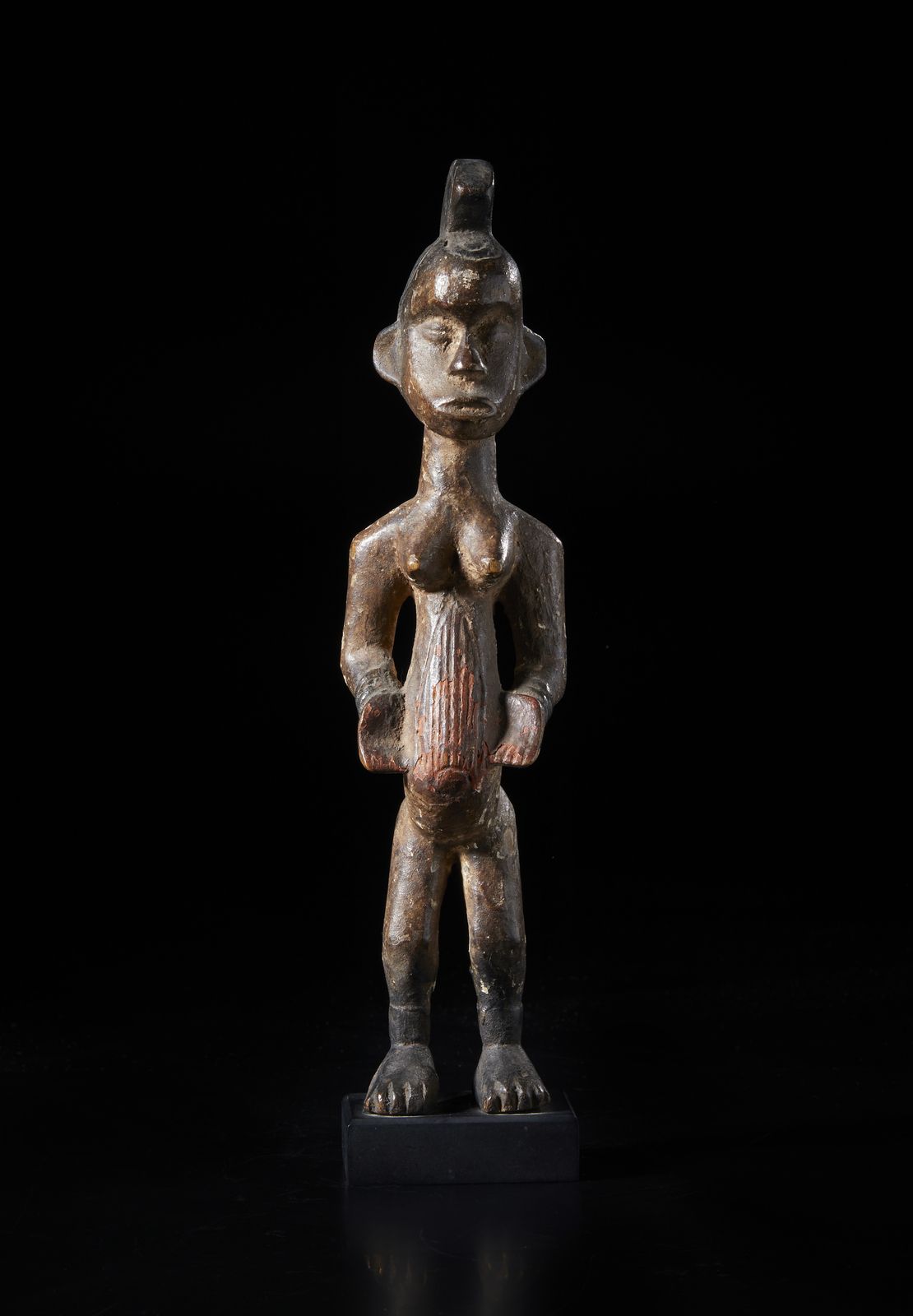 Scultura antropomorfa. Legno a patina marrone, pigmenti.