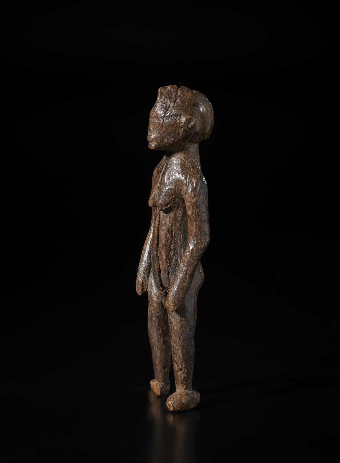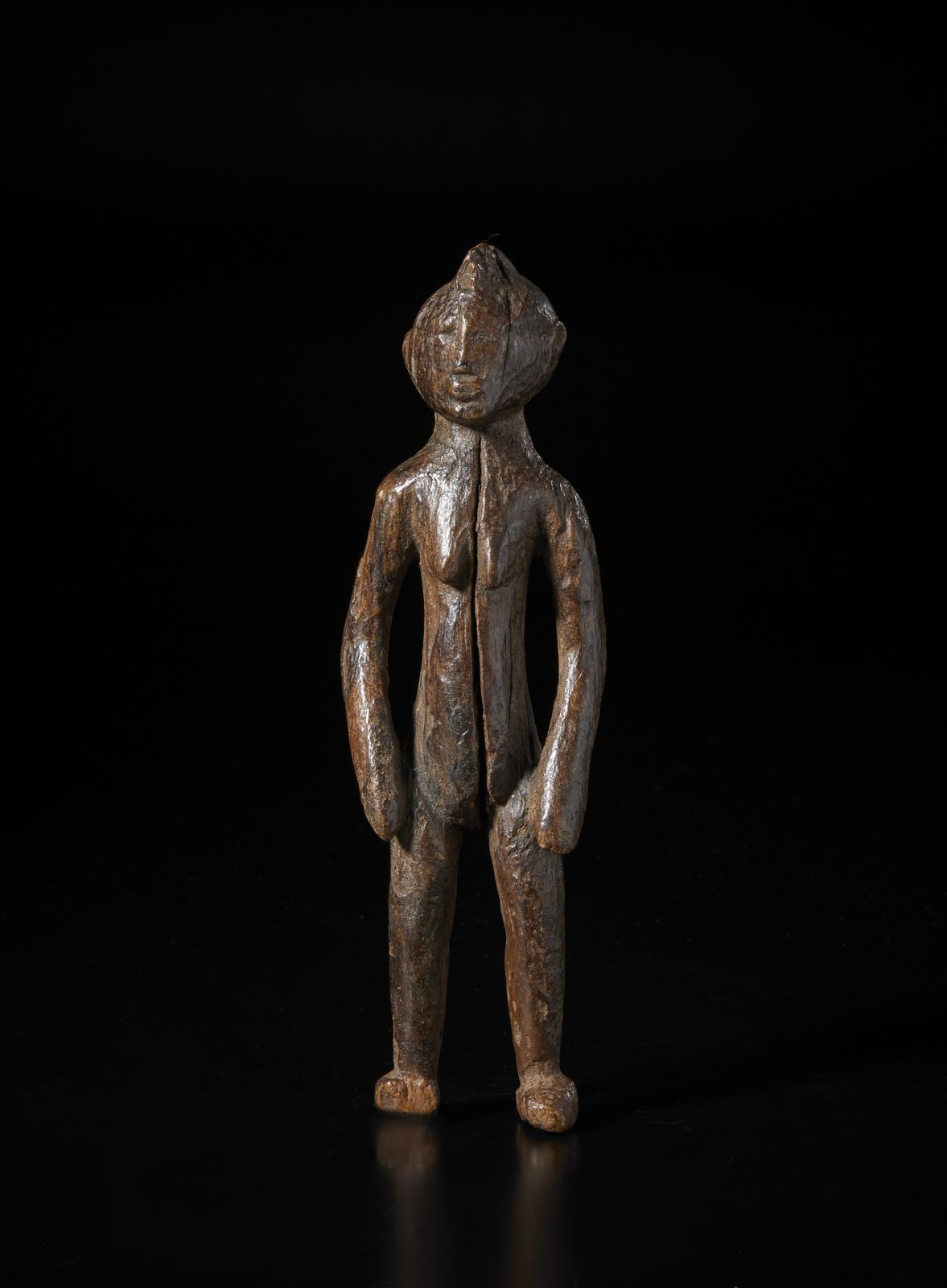 Scultura antropomorfa. Legno a patina marrone lucida.
