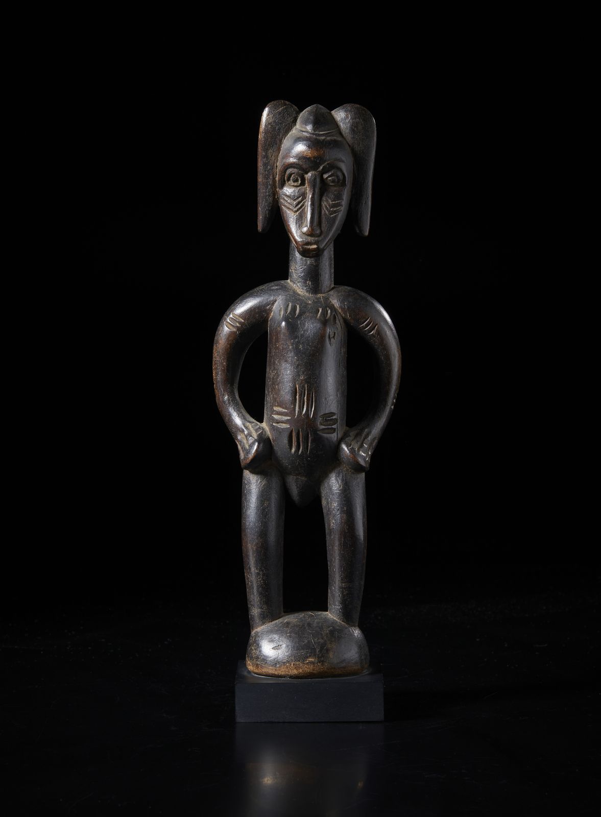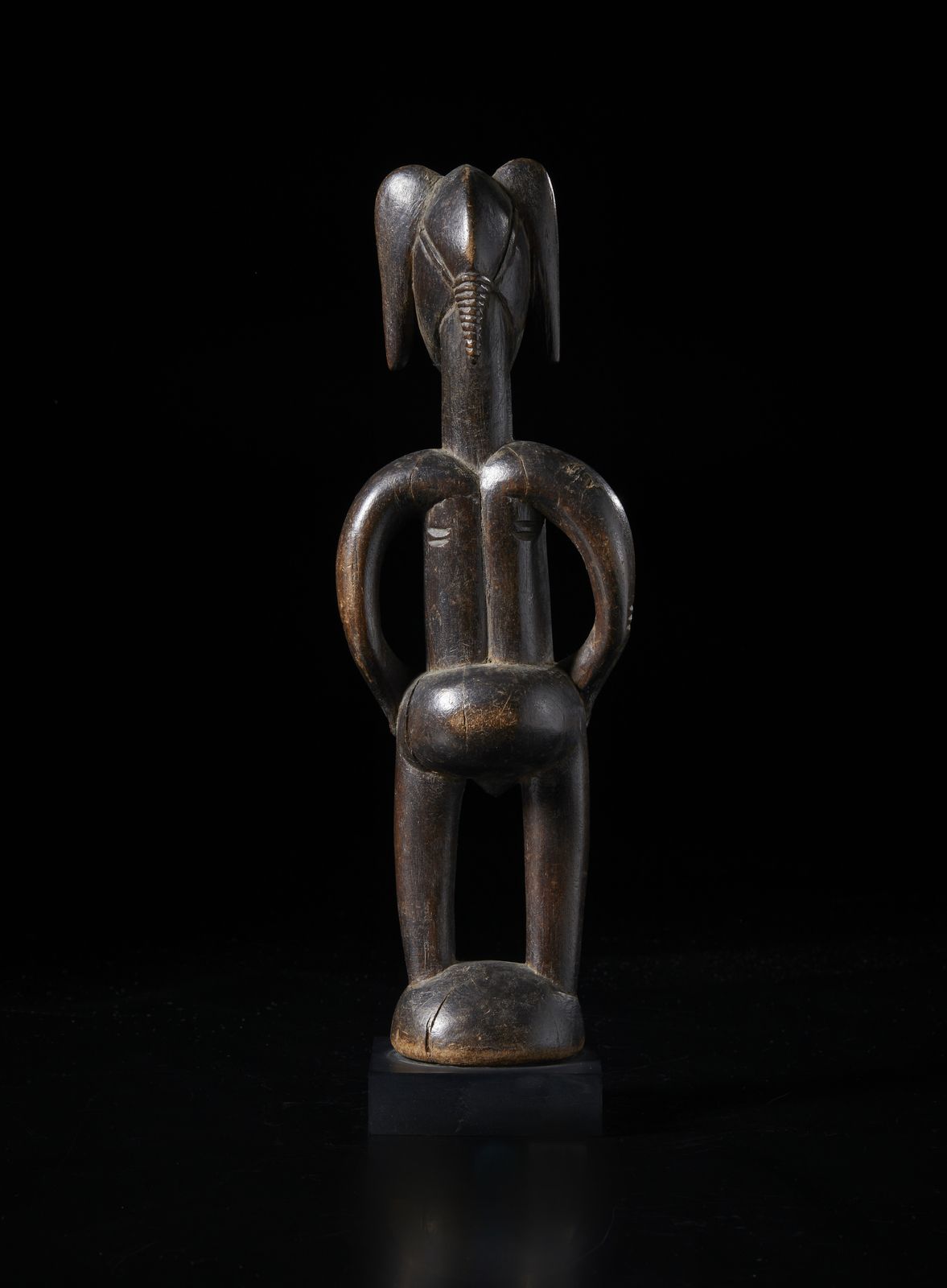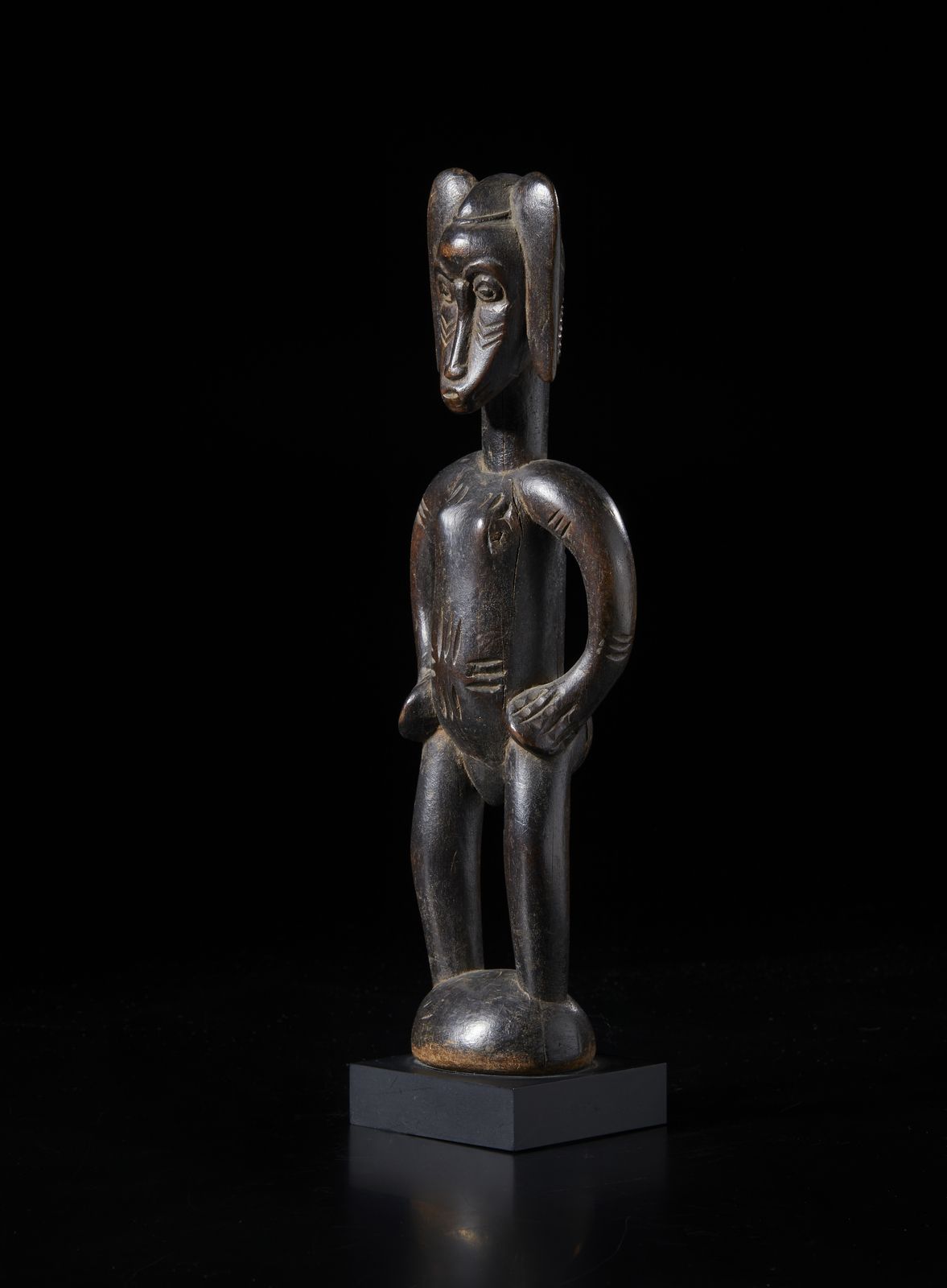 Scultura antropomorfa. Legno duro a patina scura.