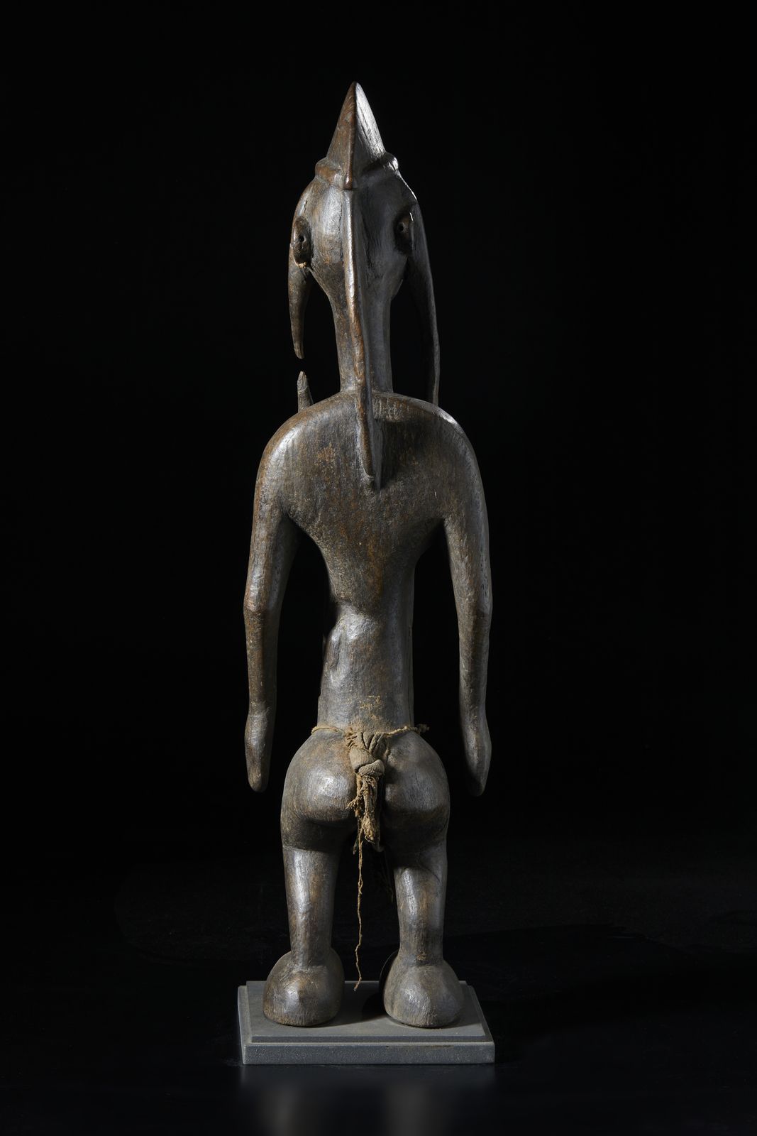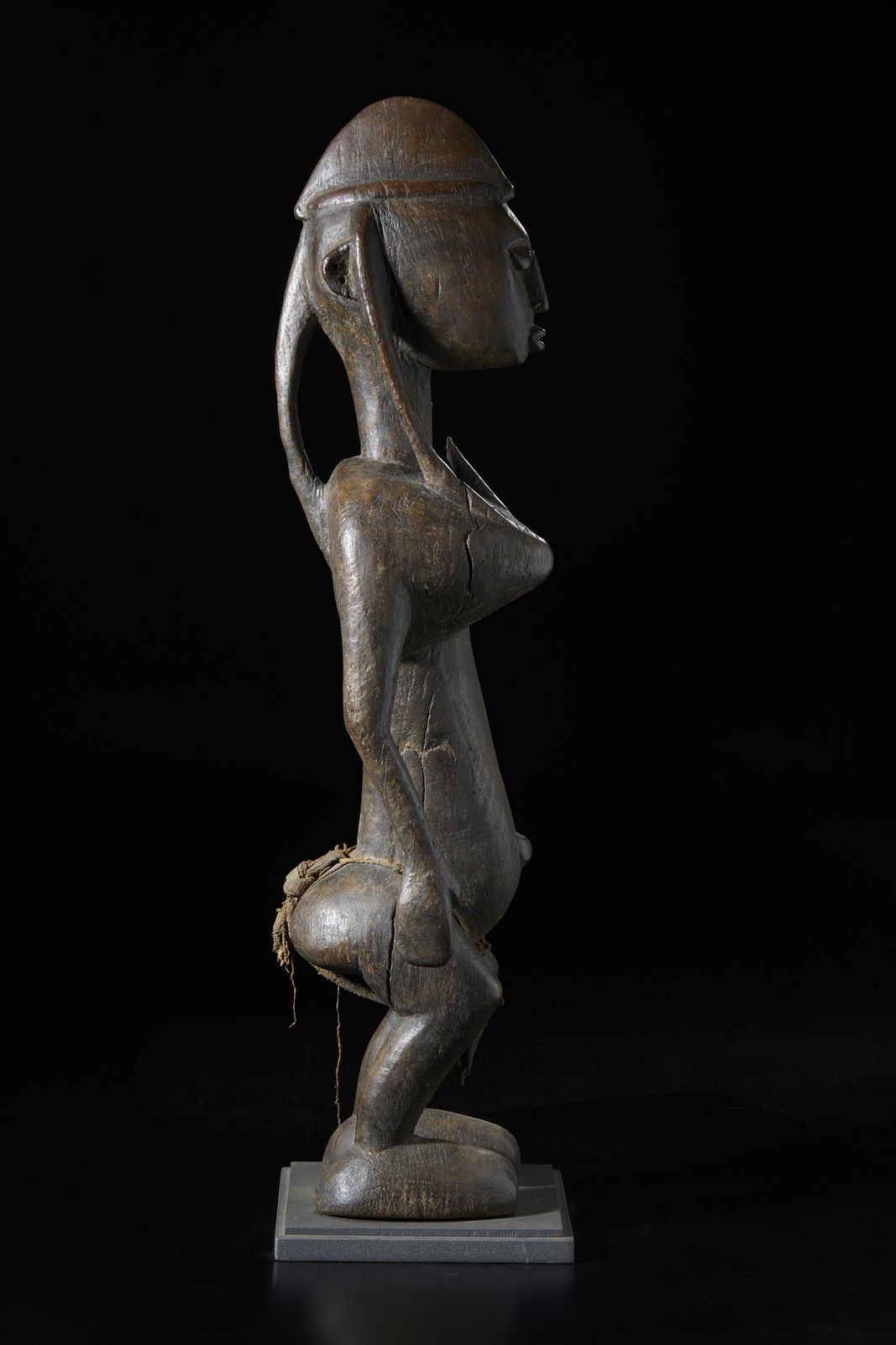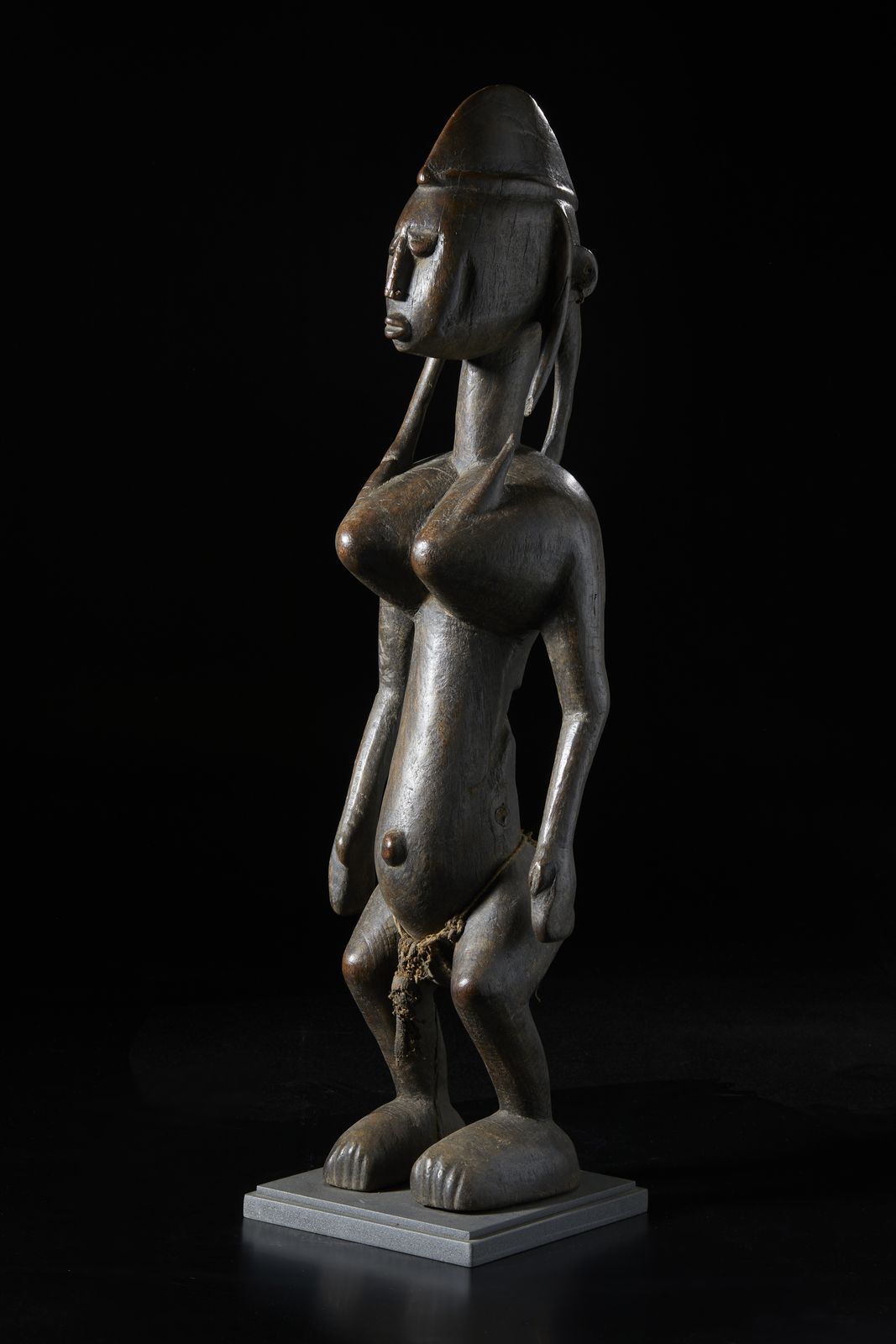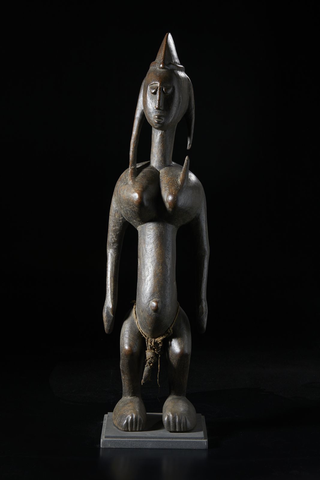 Scultura antropomorfa. Legno duro a patina scura e tessuto.