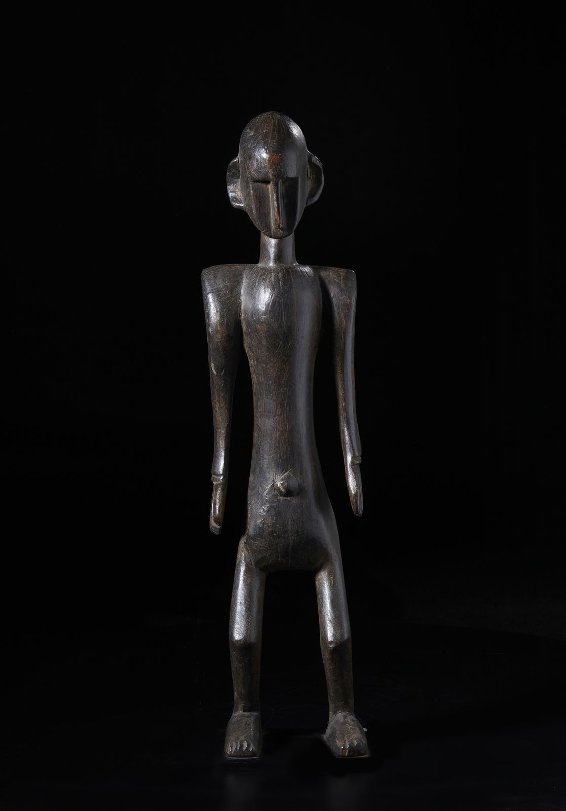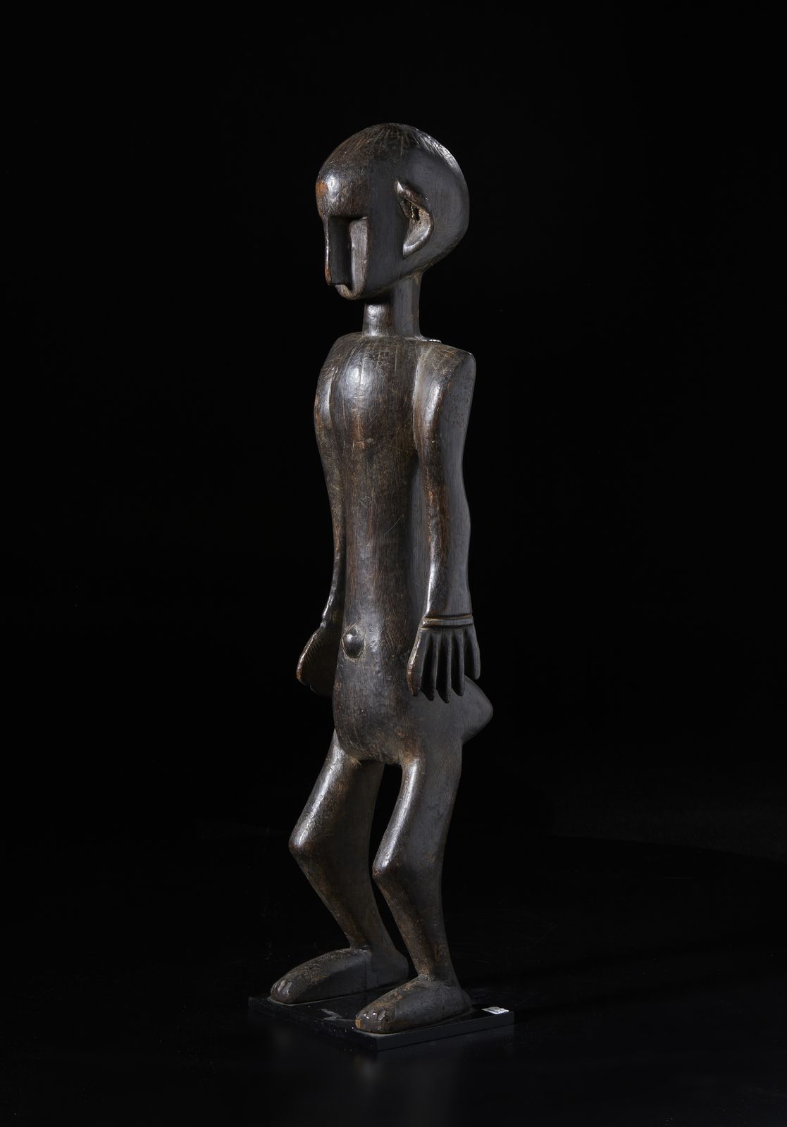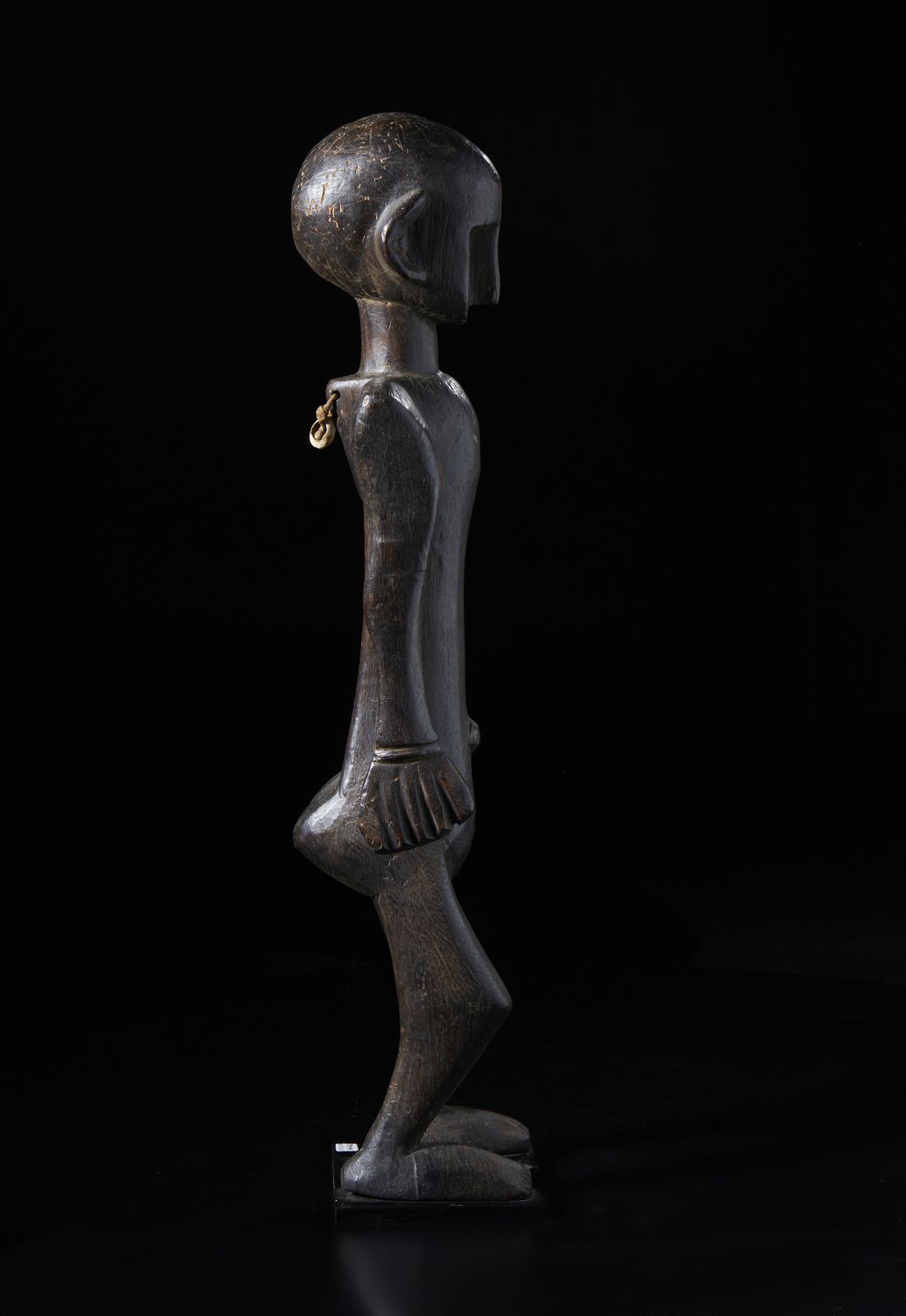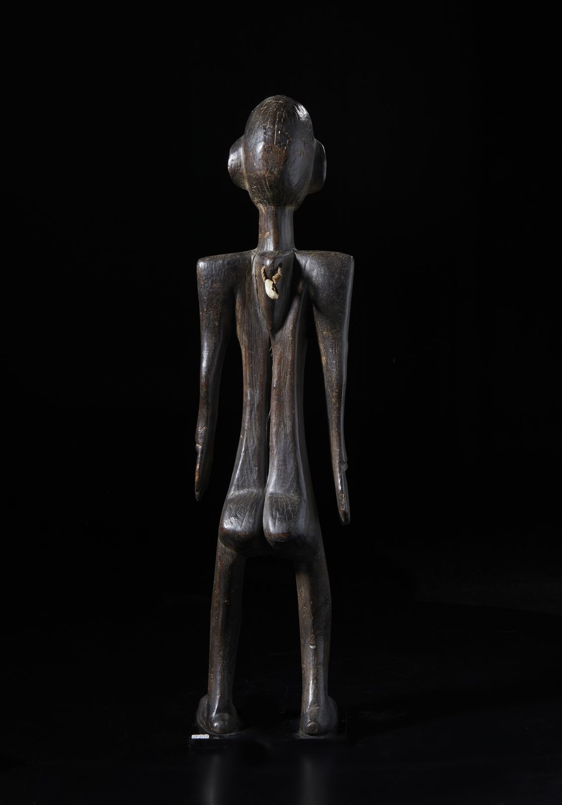 Scultura antropomorfa. Legno duro a patina scura, corda e conchiglia.