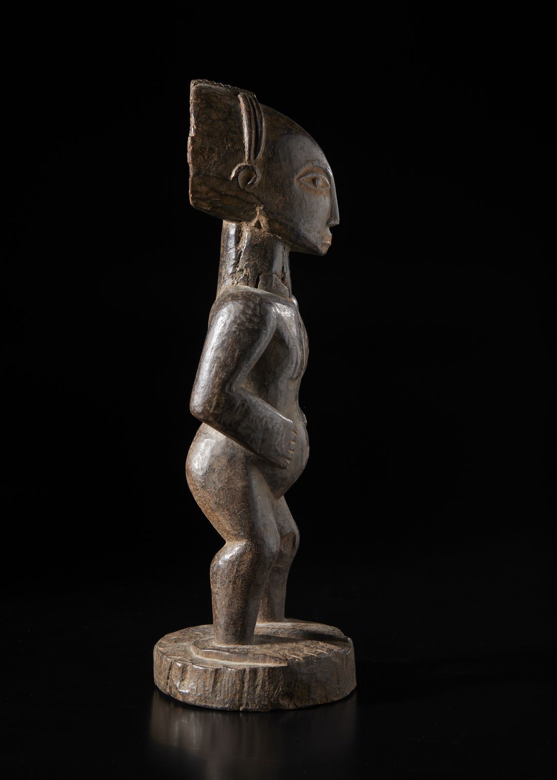 Scultura antropomorfa maschile. Legno duro a patina scura.