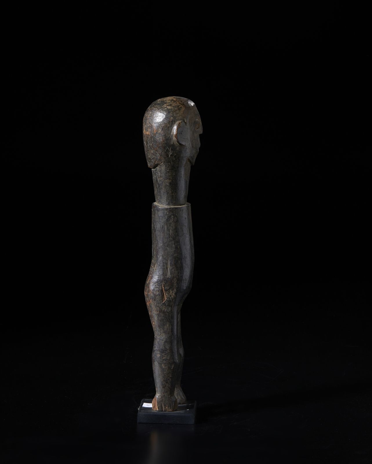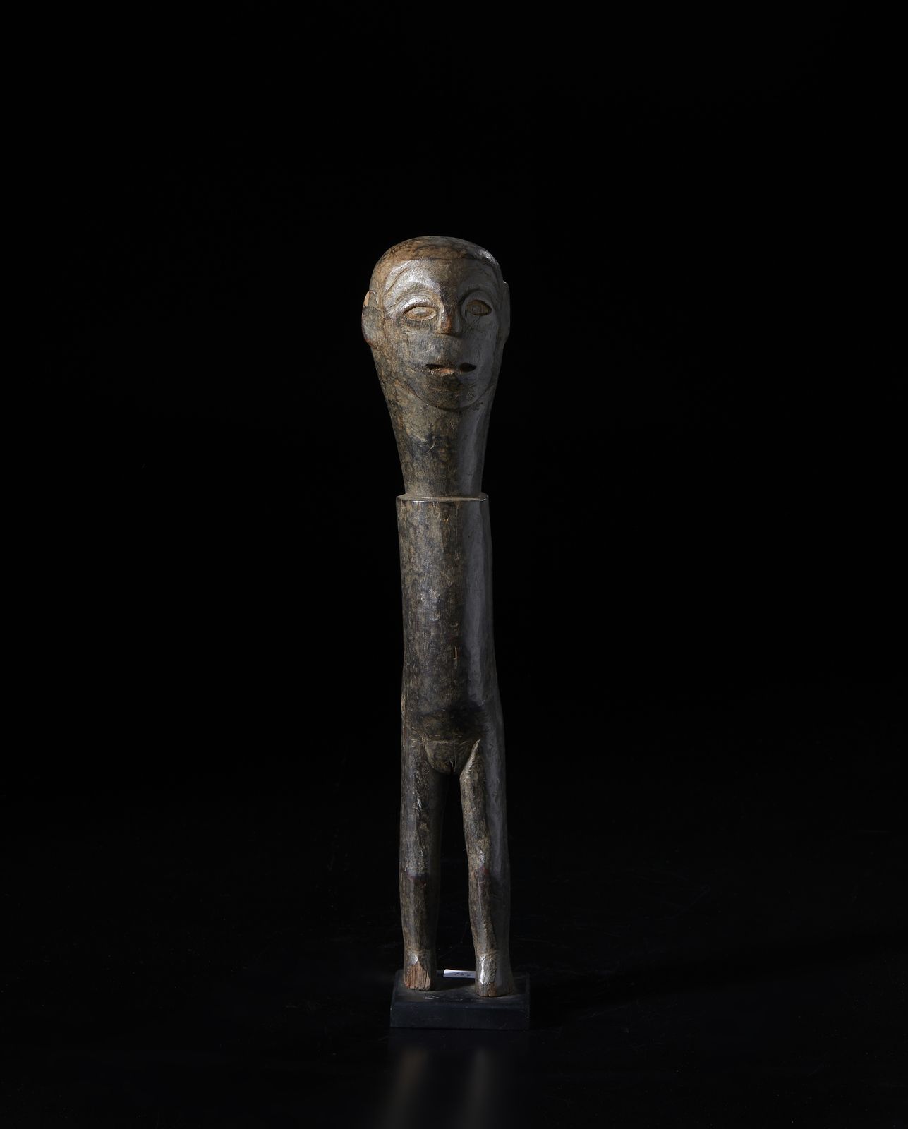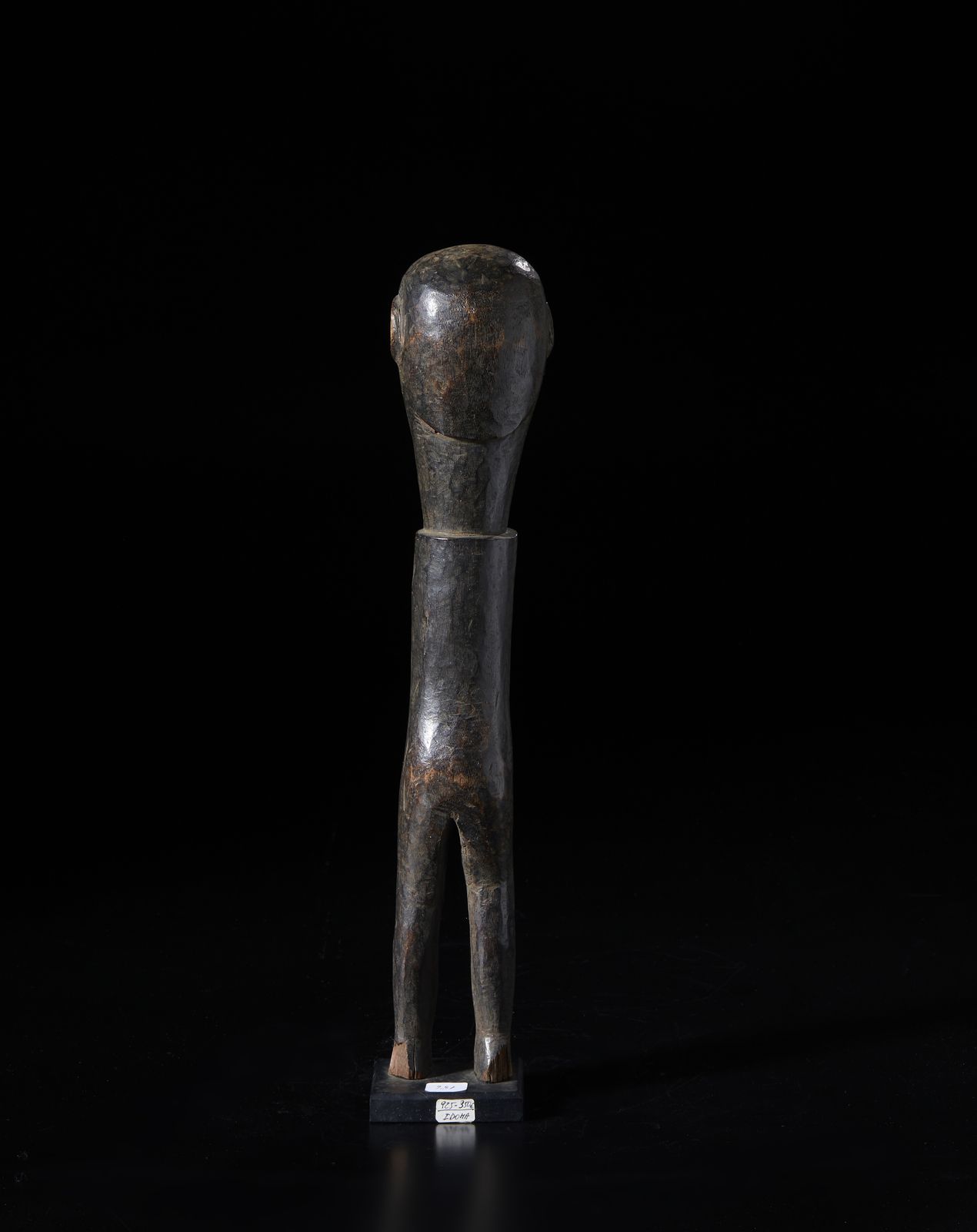 Scultura antropomorfa rappresentata senza braccia. Legno a patina scura.