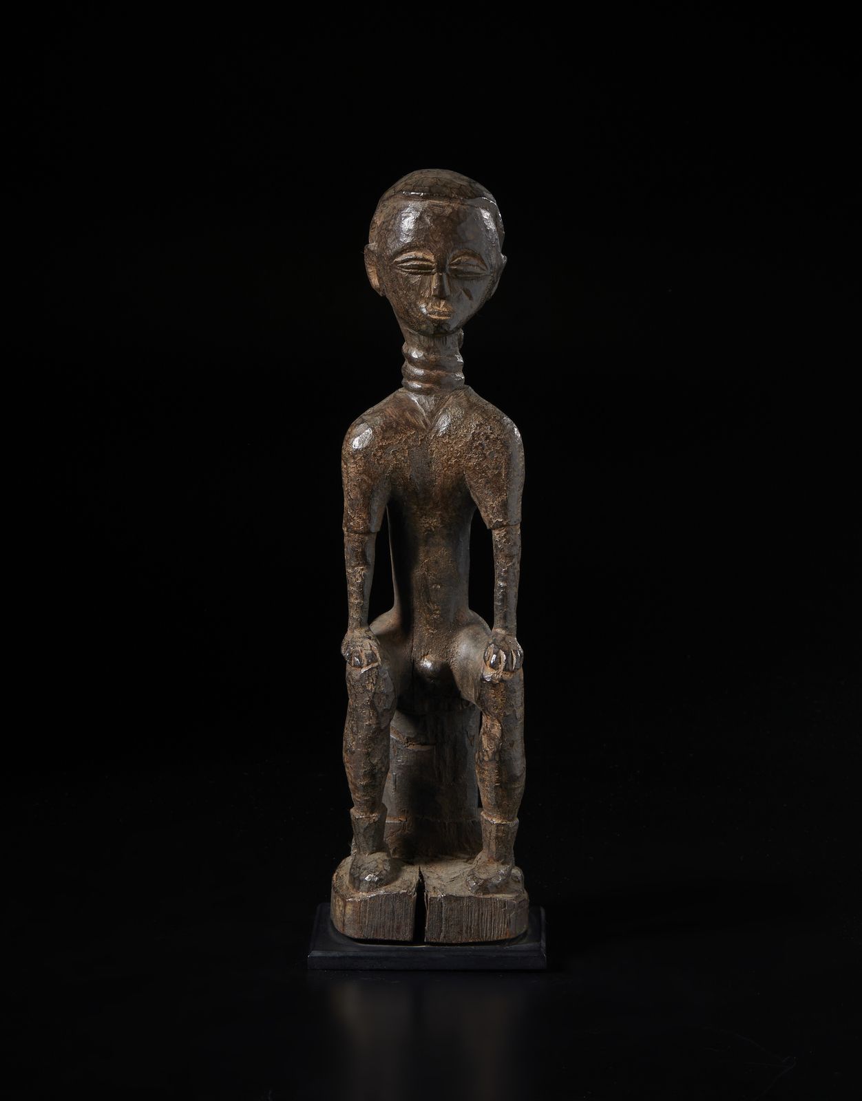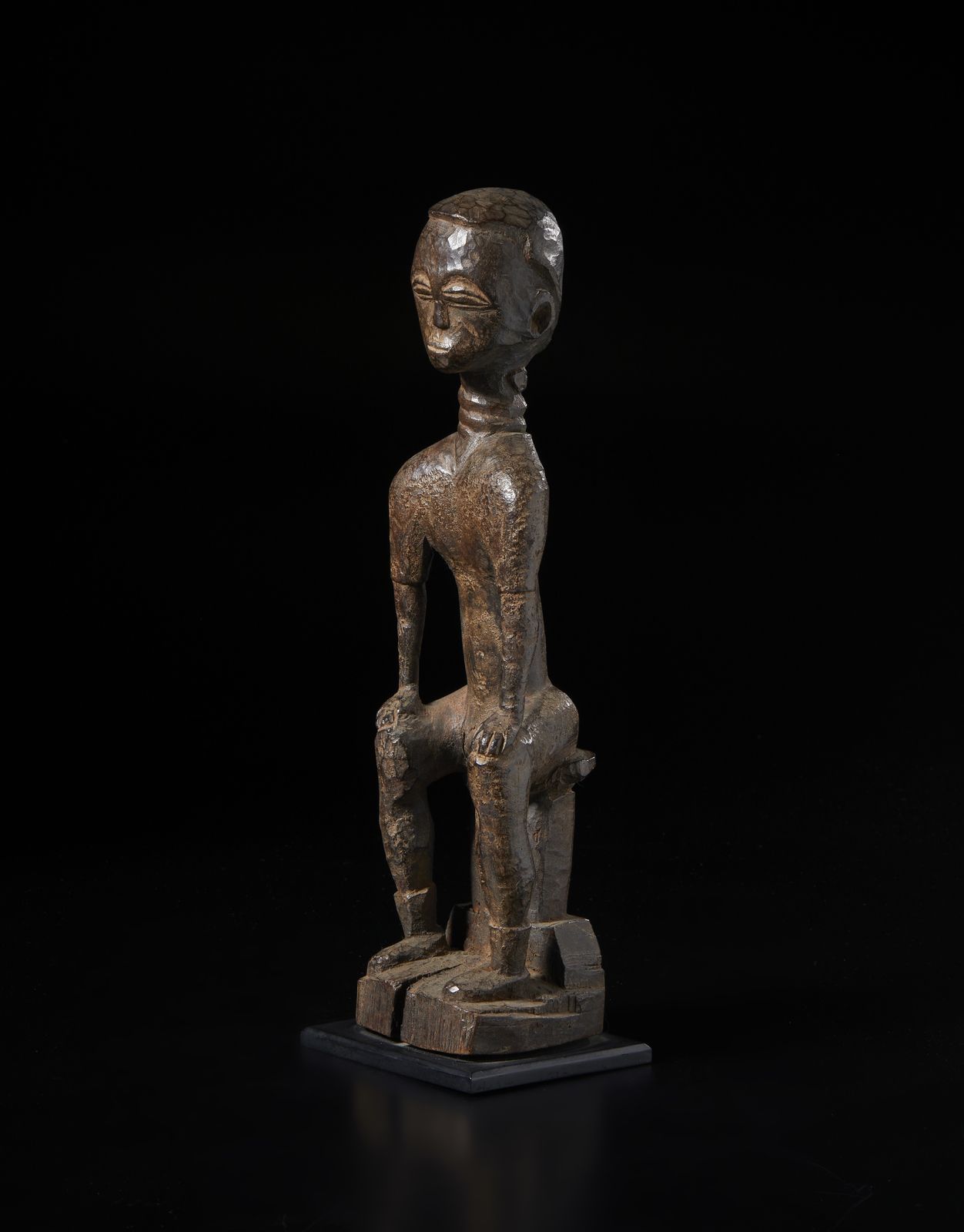 Scultura antropomorfa seduta.Legno duro a patina marrone.