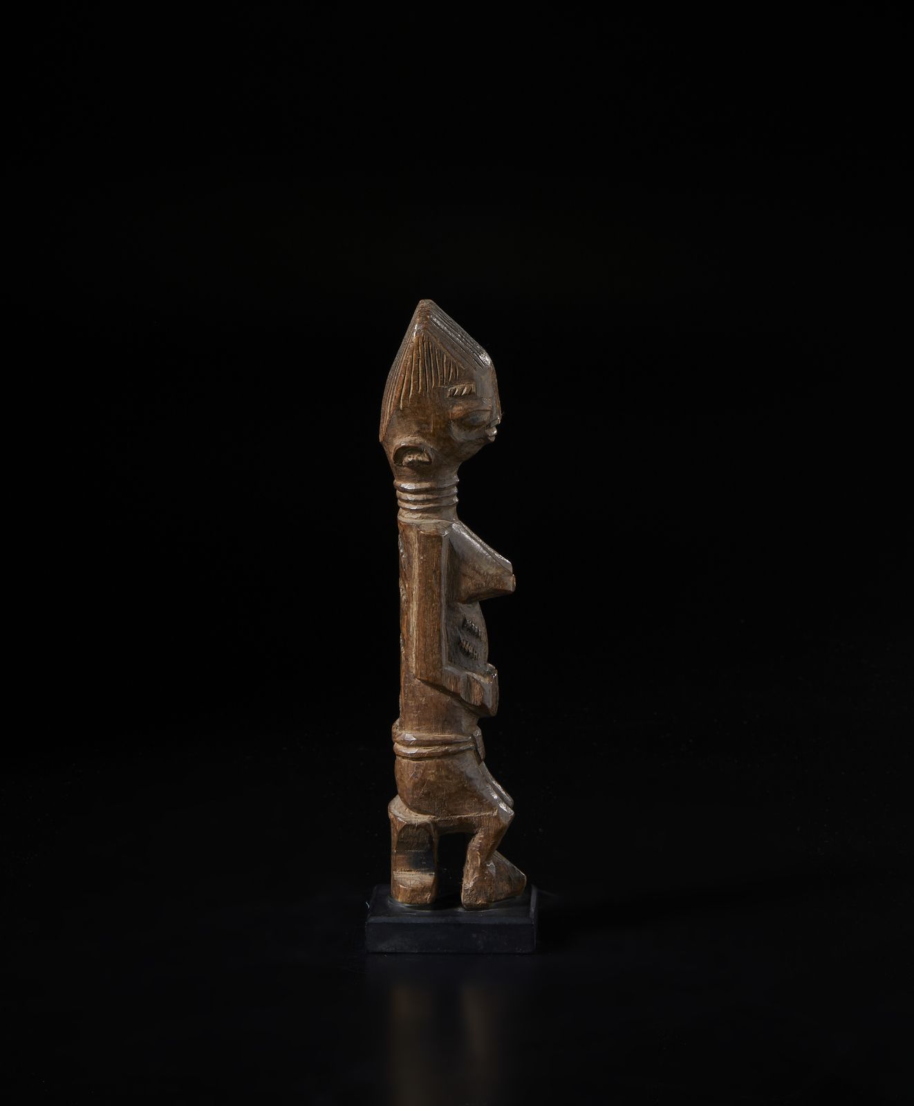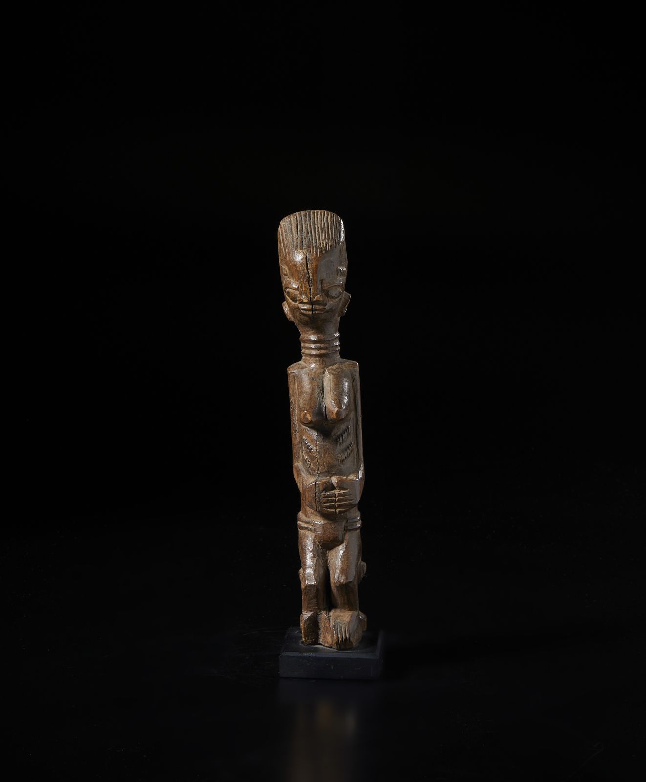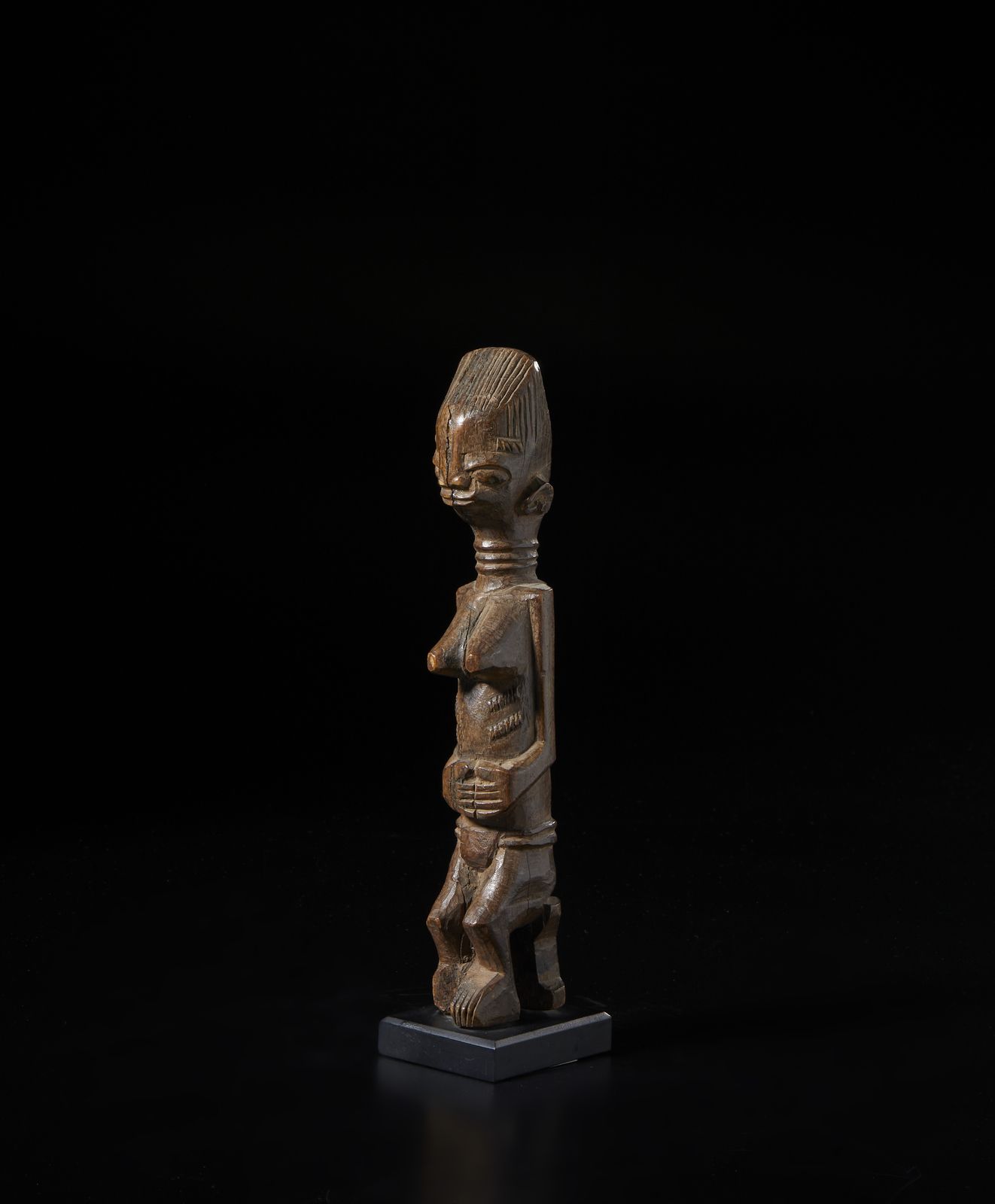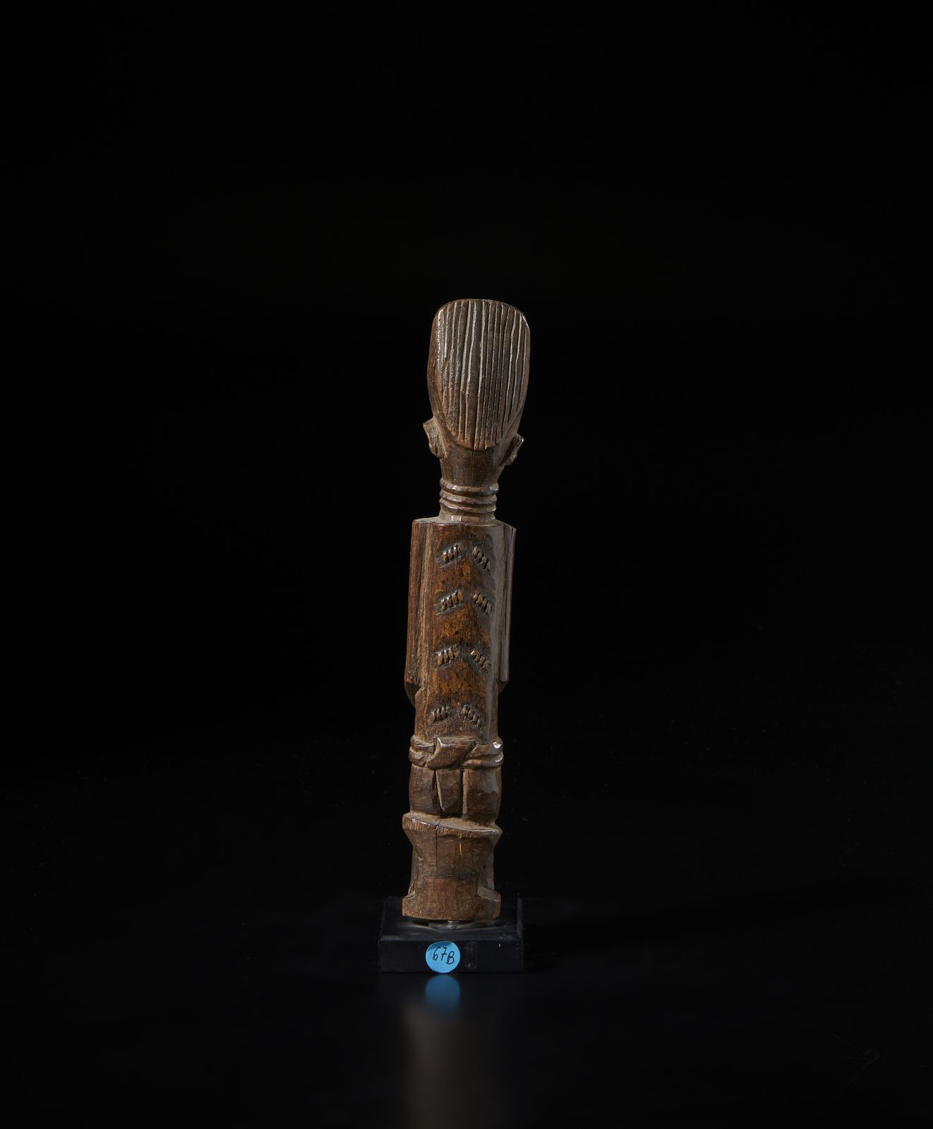 Scultura antropomorfa seduta su seggio Fanti.Legno duro a patina marrone.