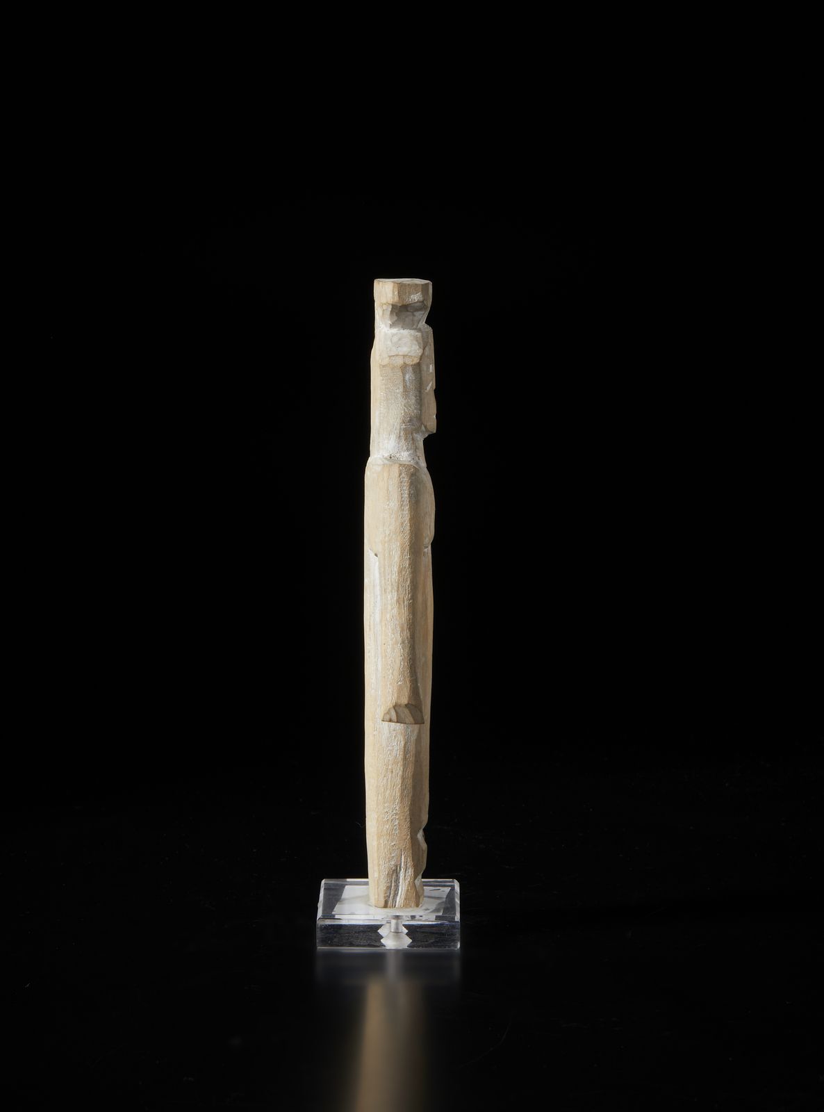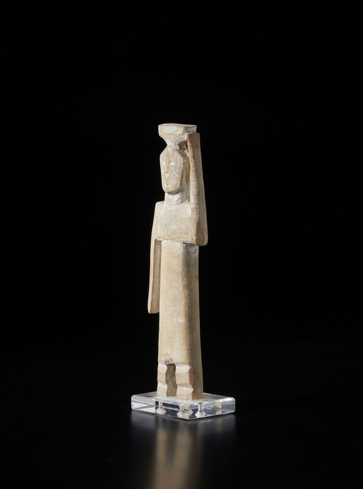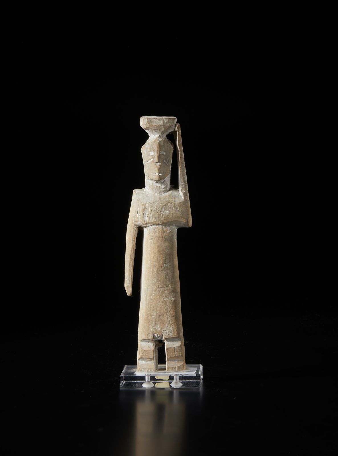 Scultura antropomorfa stilizzata Aklama. Legno duro a patina chiara e caolino.