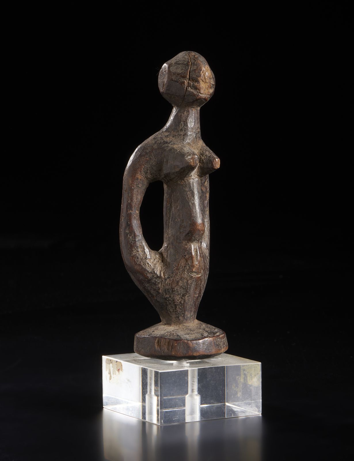 Scultura antropomorfa stilizzata. Legno duro a patina scura.