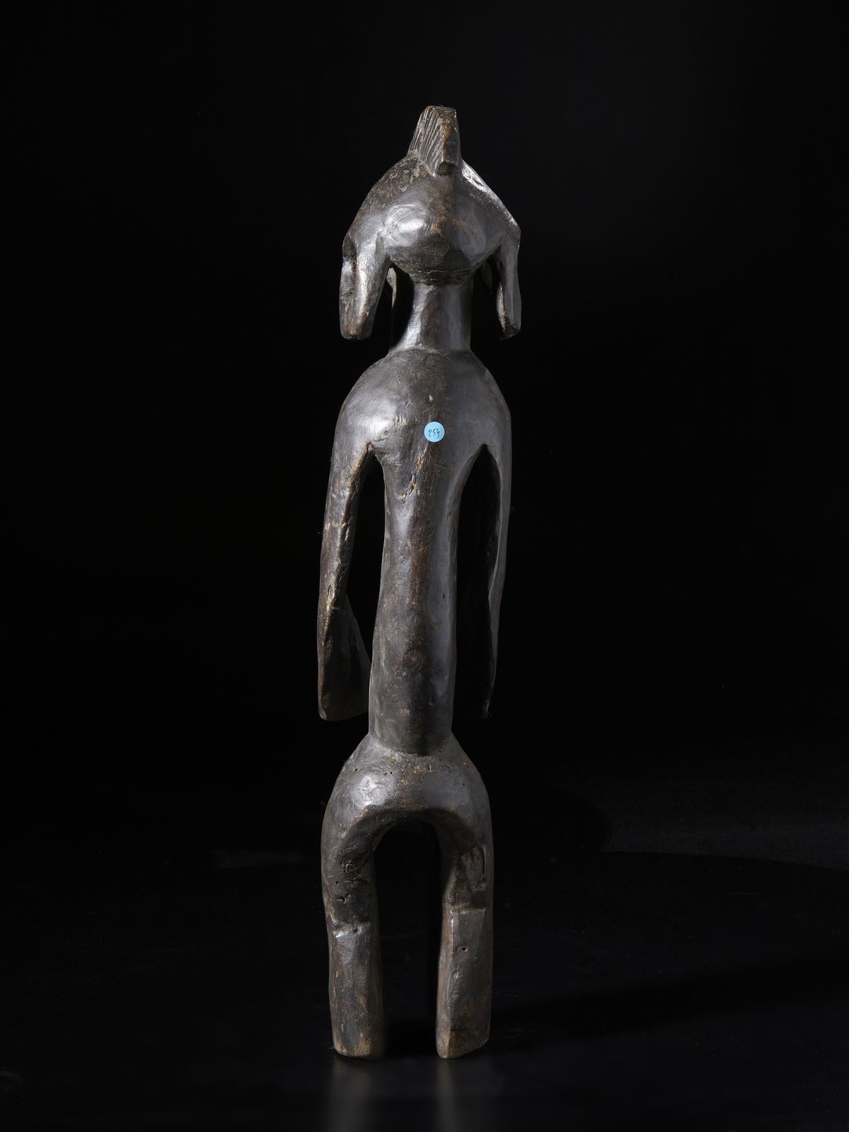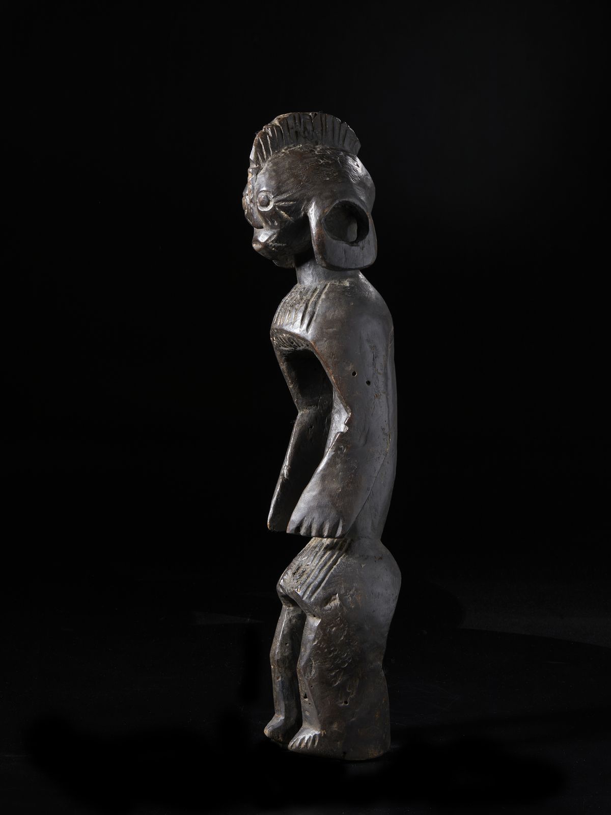 Scultura antropomorfa stilizzata.Legno duro a patina scura con tracce di caolino [..]