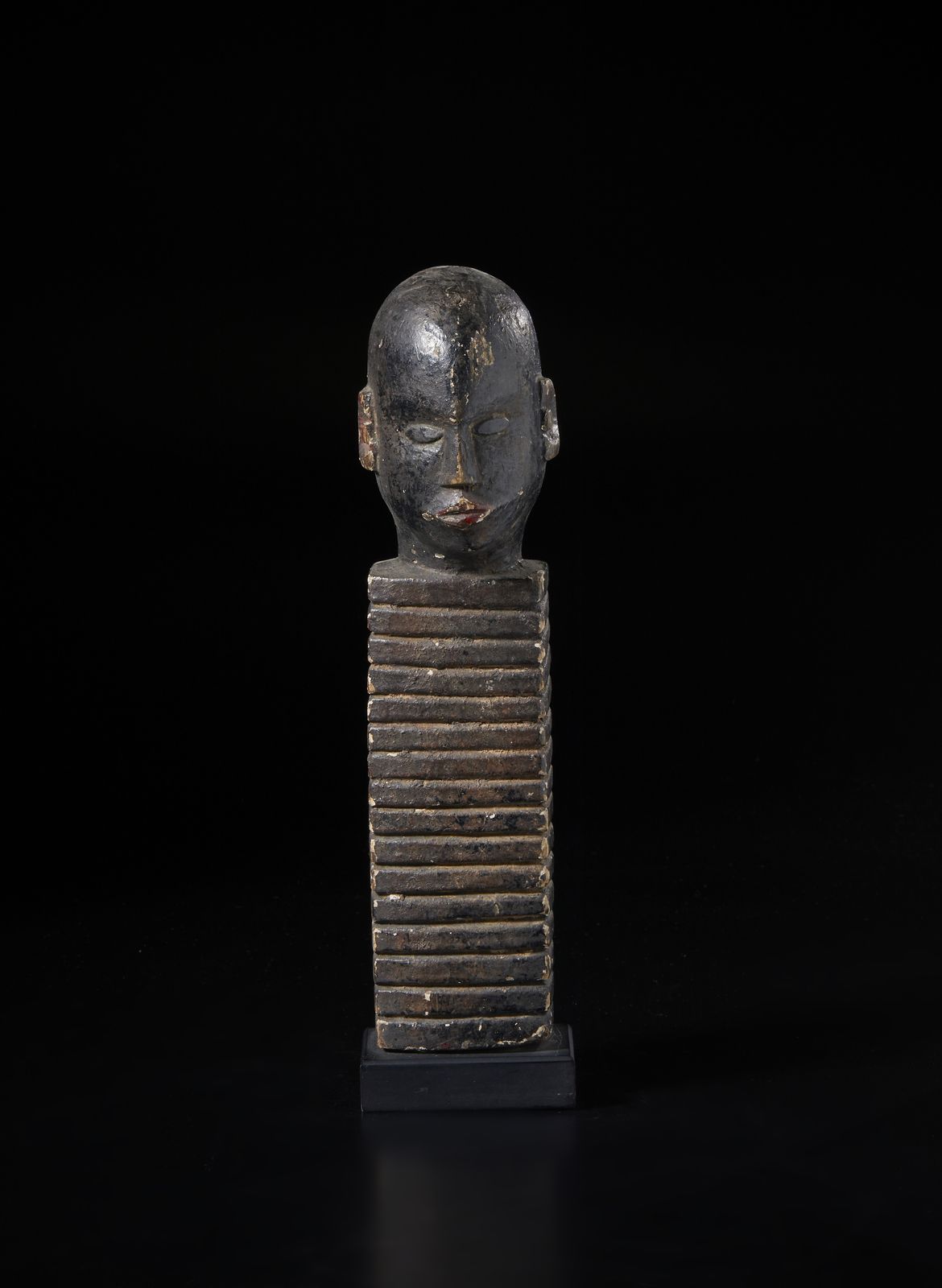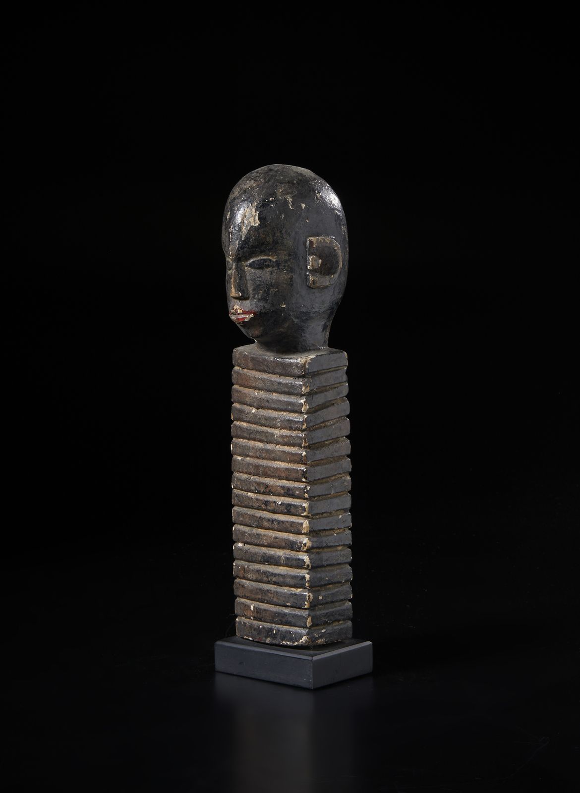 Scultura con testa antropomorfa su colonna lavorata e incisa geometricamente.Legno [..]