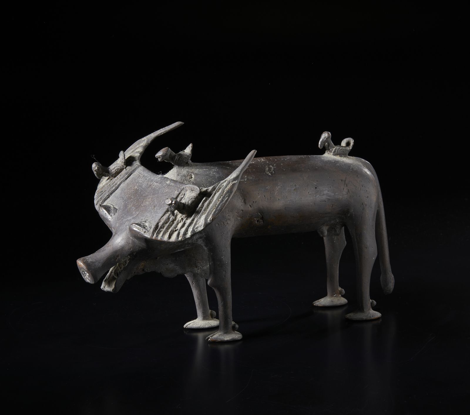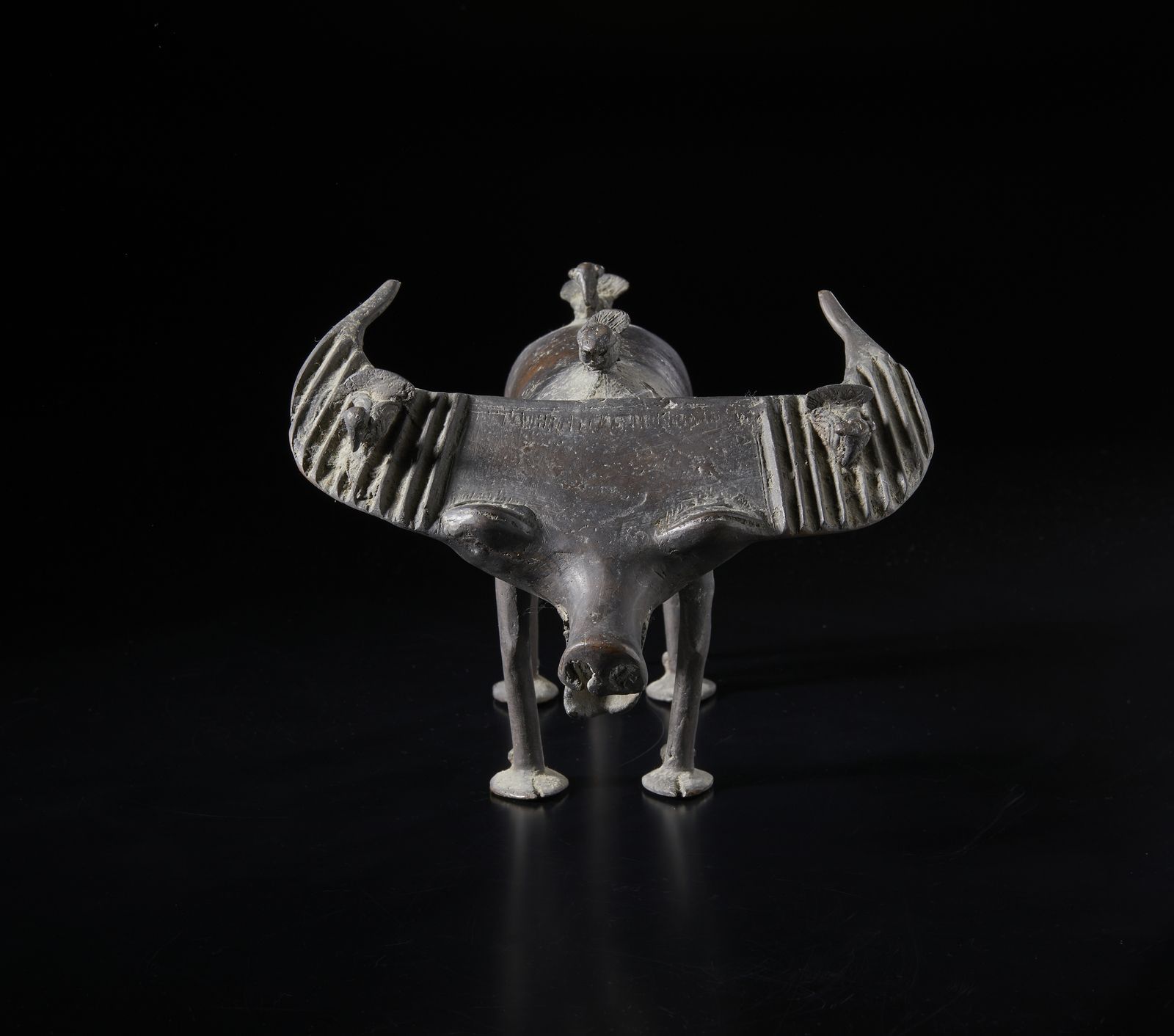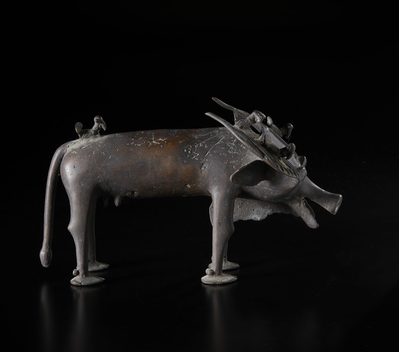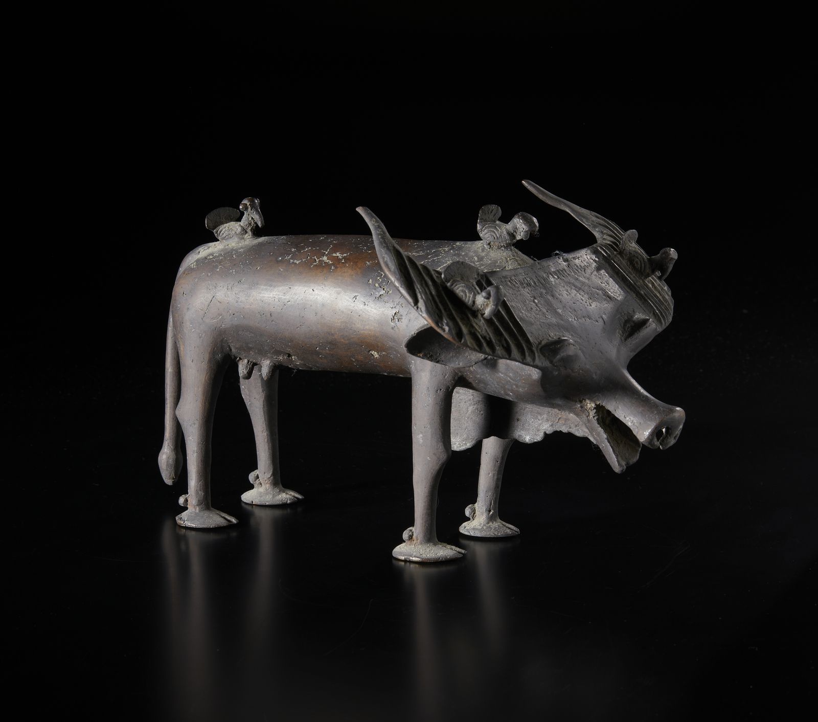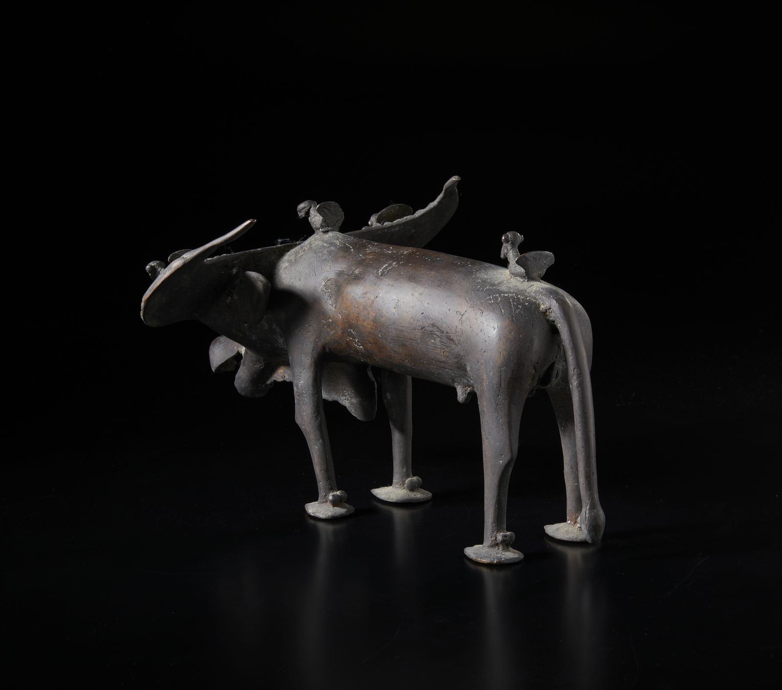 Scultura zoomorfa a forma di bufalo con uccelli. Lega di rame.
