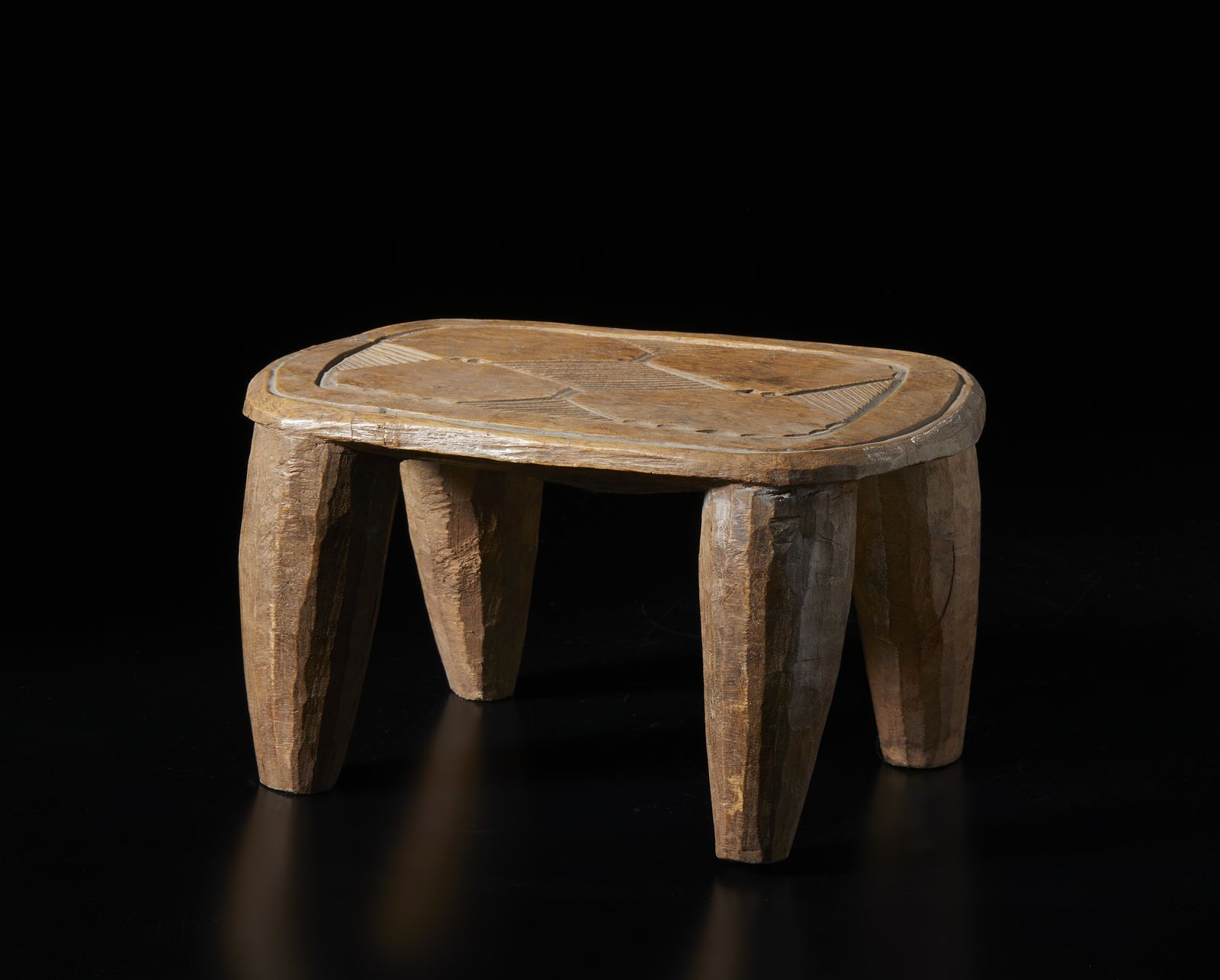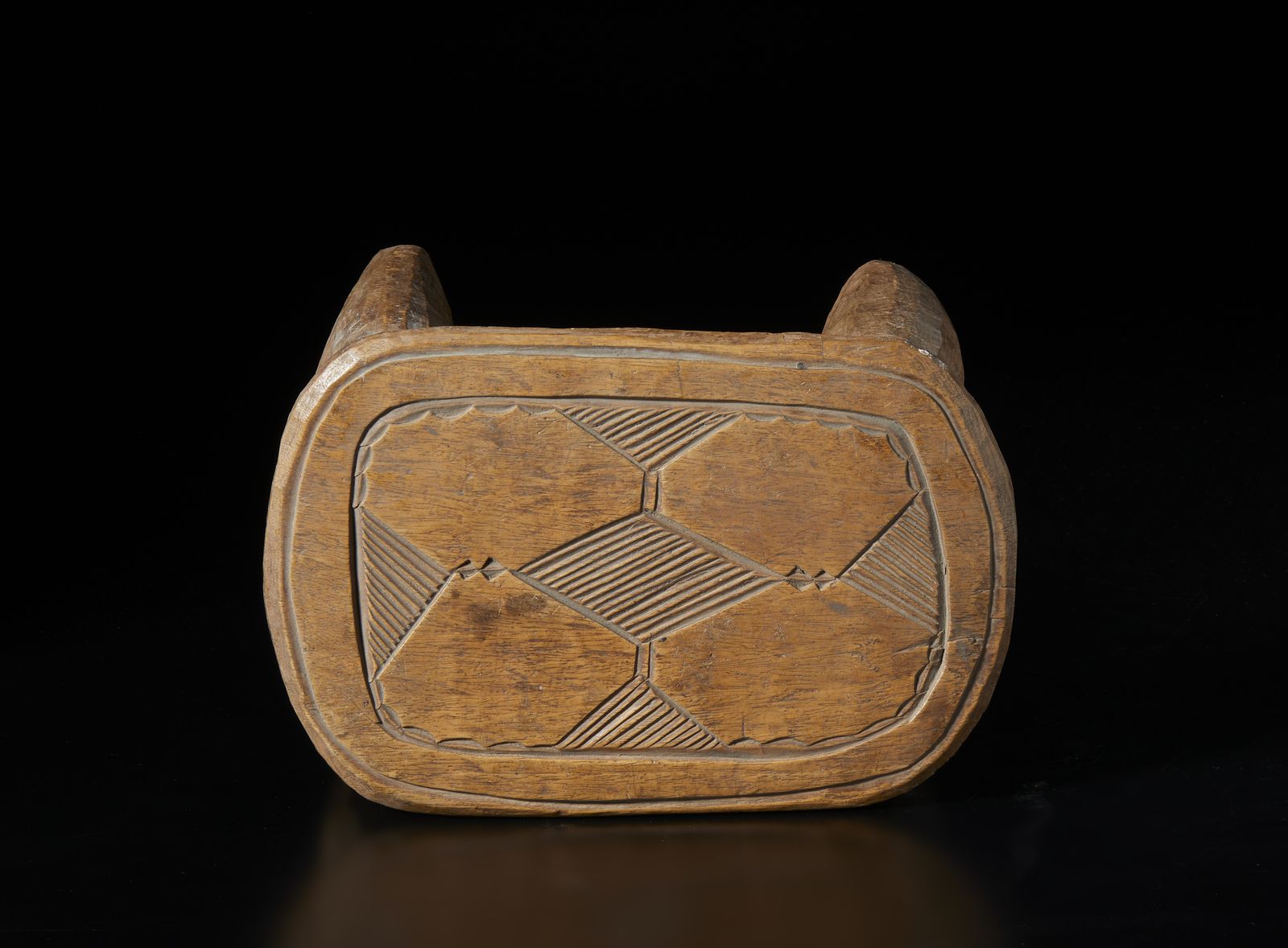 Seggio con decori geometrici astratti. Legno duro a patina naturale.