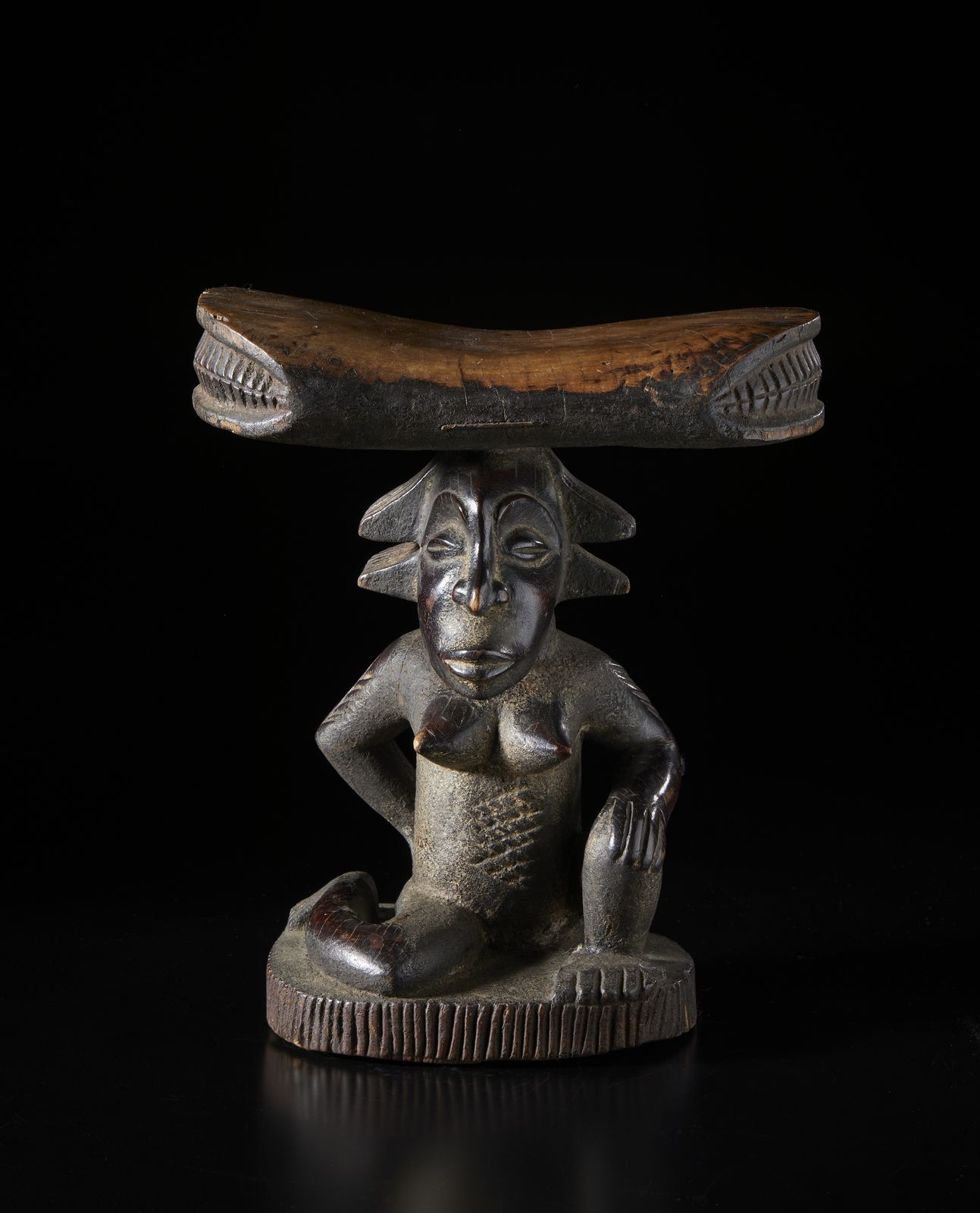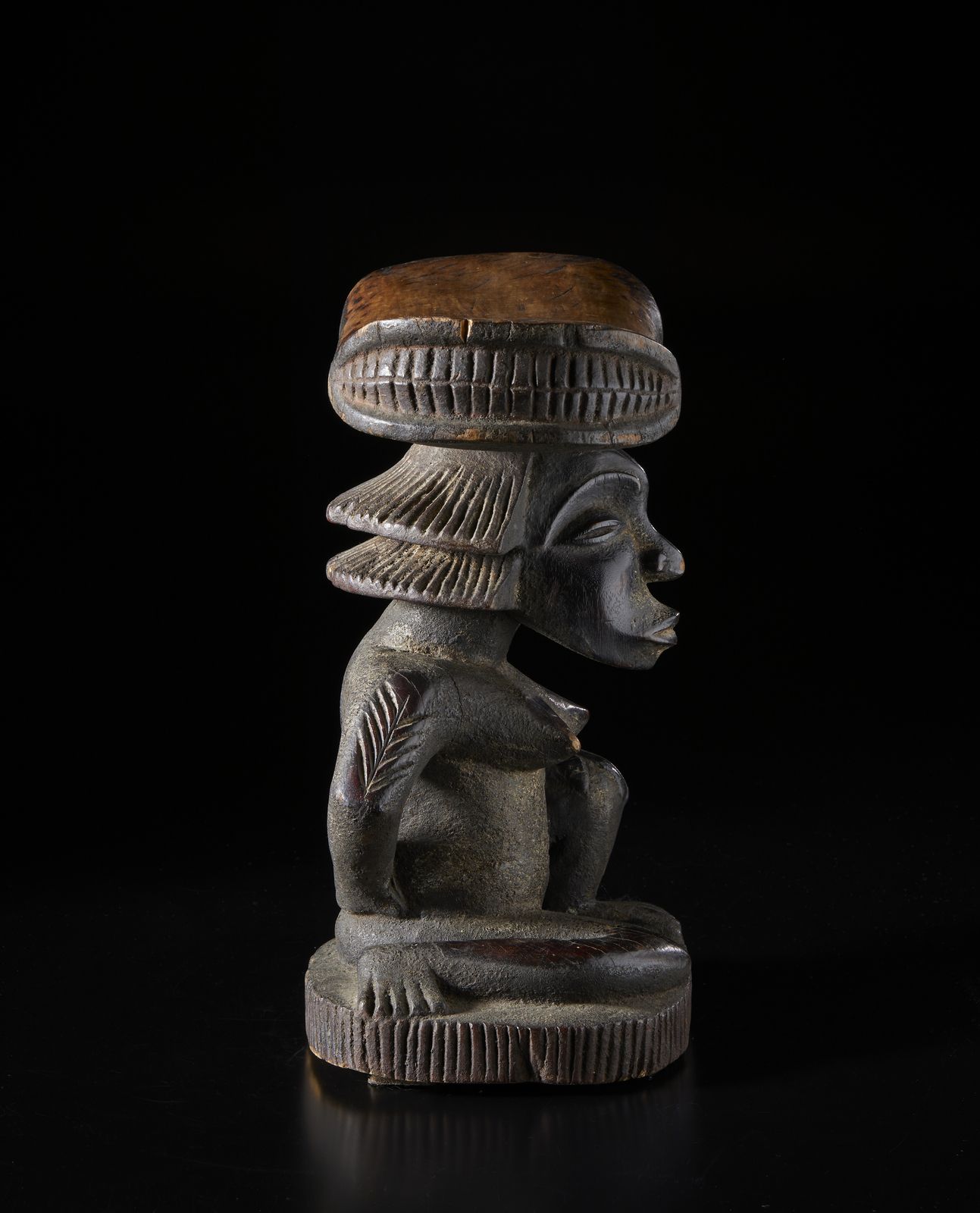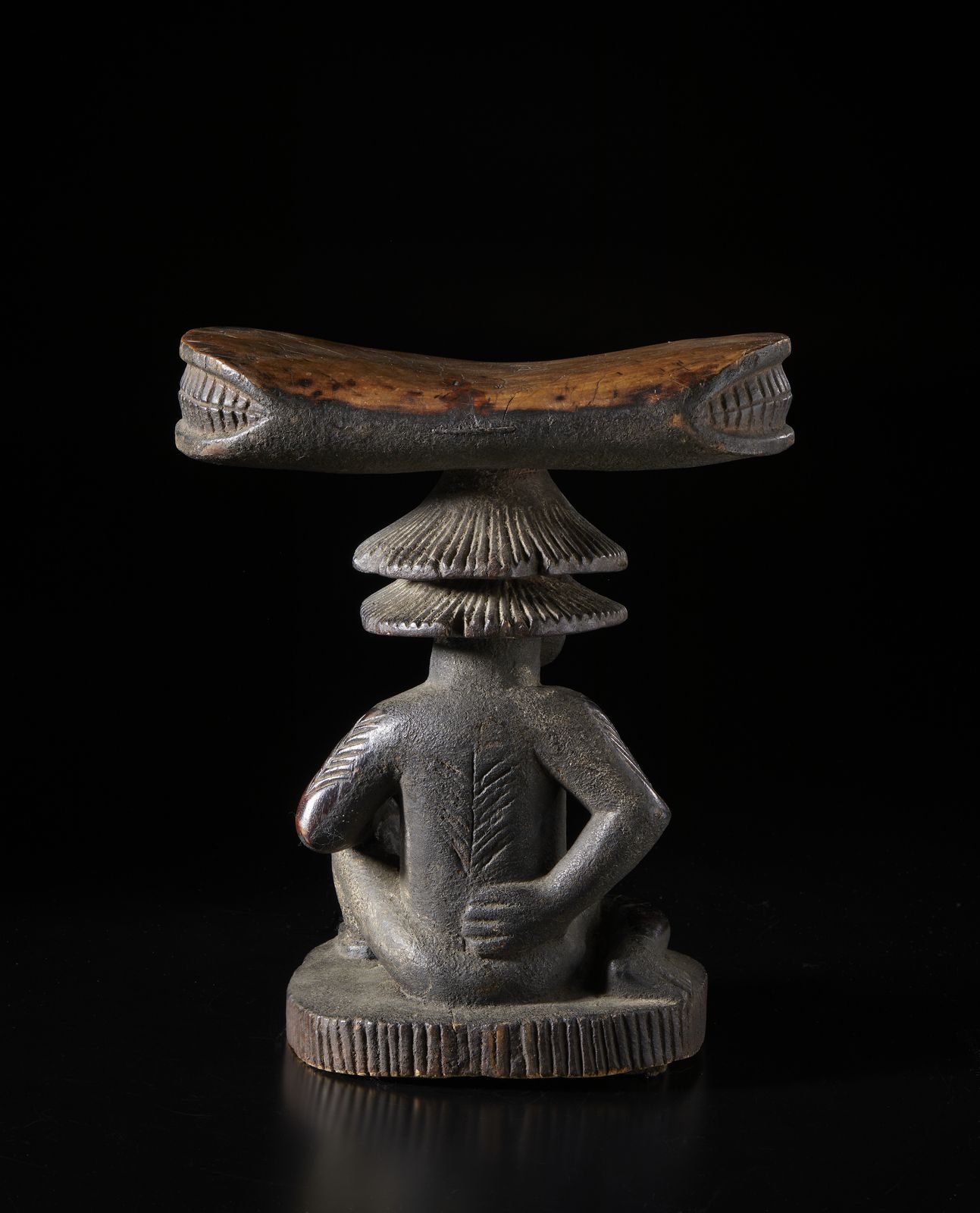 Seggio Hemba o Luba con cariatide antropomorfa seduta.Legno duro a patina scura [..]