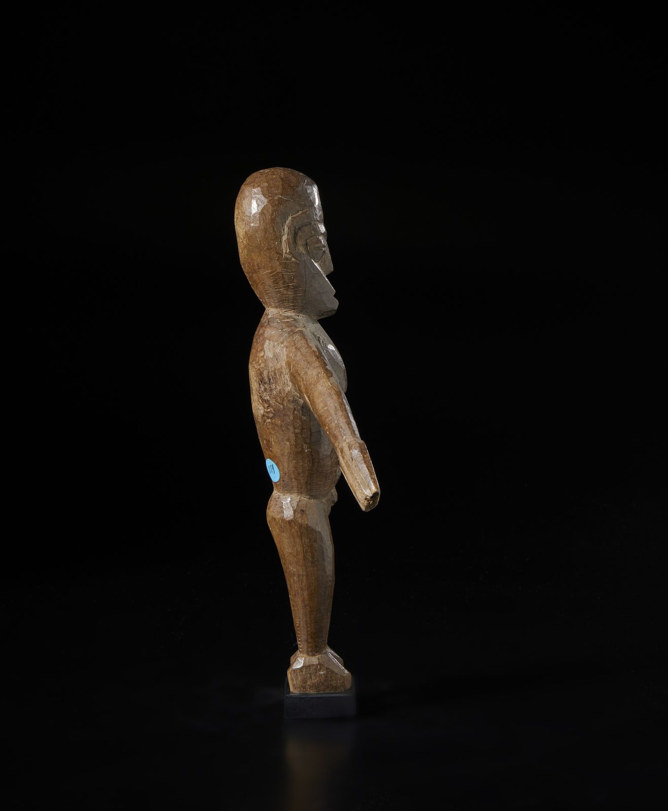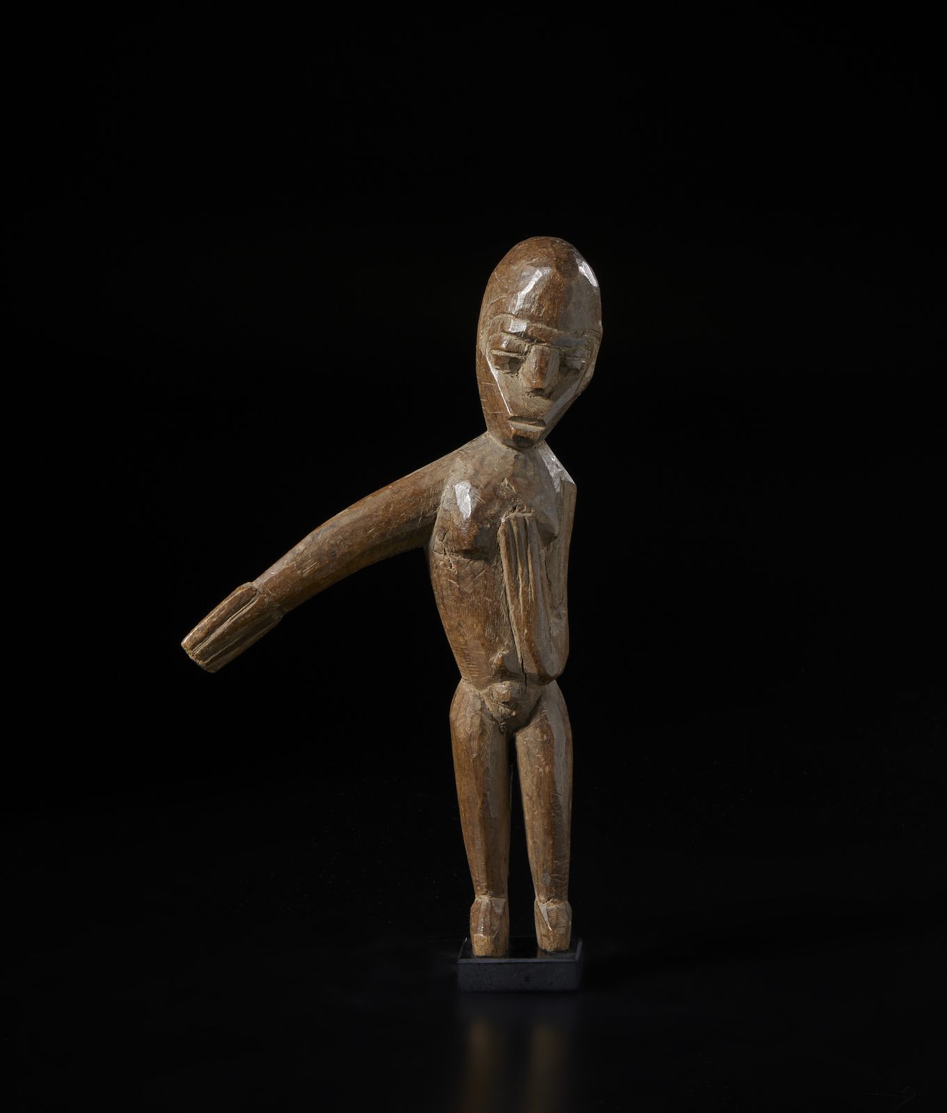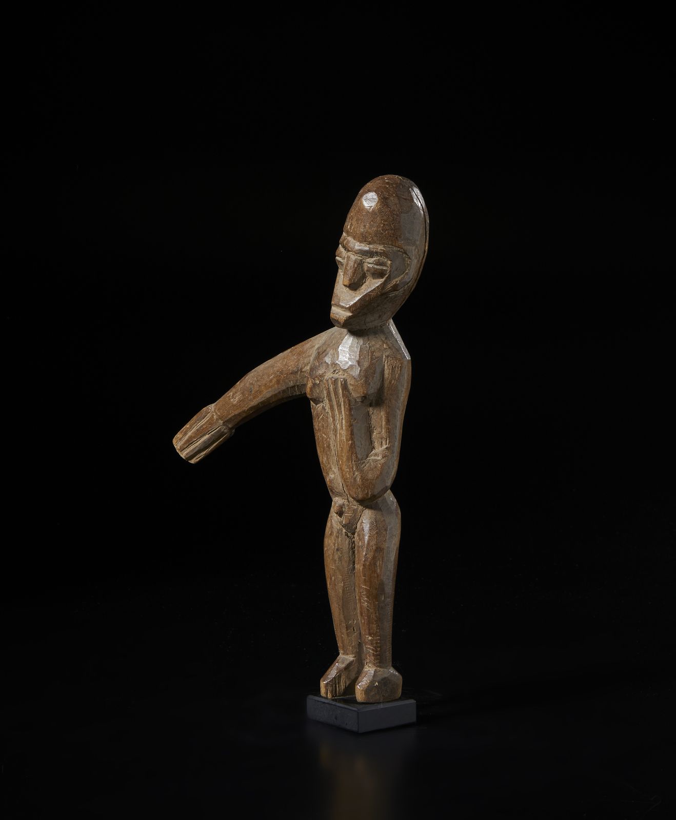 Statua antropomorfa con braccio alzato.Legno duro a patina naturale.