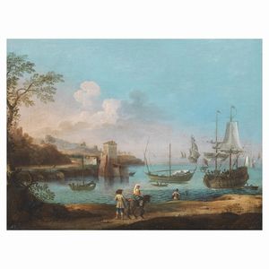 Scuola olandese, sec. XVIII PAESAGGI MARINI CON NAVI coppia di dipinti, olio su tela, cm 67x89 (2) Dutch school, [..]