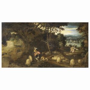 Artista nordico, sec. XVIII PAESAGGIO CON PASTORE, GREGGE E VIANDANTI olio su tela, cm 71x133,5 Northern painter, [..]