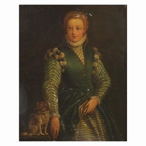 Scuola dell'Italia settentrionale, sec XVII RITRATTO DI NOBILDONNA CON CAGNOLINO olio su tavoletta, cm 21x17 [..]