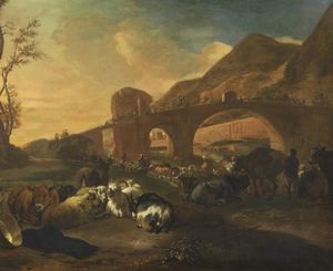 Willem Romeyn (Harlem 1624 ca. - post 1693) PAESAGGIO CON ARMENTI E PONTE SULLO SFONDO olio su tela, cm 65x80,5 [..]
