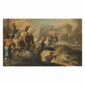 Scuola italiana, sec. XVII SCENA DI ASSEDIO olio su tela, cm 51x82 Italian school, 17th century A SIEGE SCENE [..]