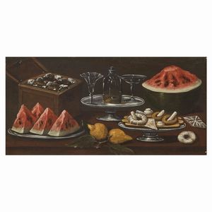 Scuola napoletana, sec. XVII NATURA MORTA CON ANGURIA E DOLCI olio su tela, cm 47x97 Neapolitan school, 17th [..]