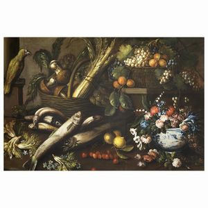 Scuola emiliana, sec. XVII NATURA MORTA CON ORTAGGI, FIORI, PESCI E PAPPAGALLO olio su tela, cm 78x118 Emilian [..]