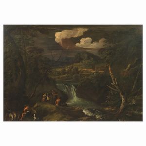Scuola romana, sec. XVIII PAESAGGIO olio su tela, cm 57x135 Roman school, 18th century A LANDSCAPE oil on canvas, [..]