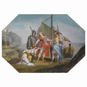 Scuola dell'Italia centrale, sec XVIII SOGGETTI MITOLOGICI coppia di dipinti ottagonali olio su vetro, cm 42,5x60 [..]