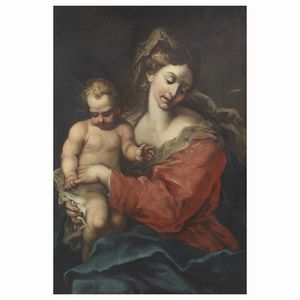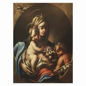 Scuola genovese, sec. XVII MADONNA CON BAMBINO E SAN GIOVANNINO olio su tela, cm 98x73 Genoese school, 17th [..]