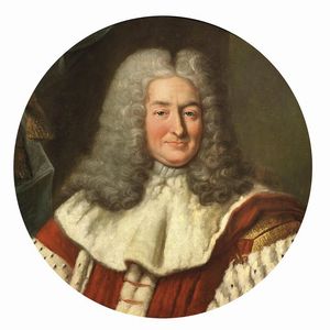 Scuola Francese, sec. XVIII RITRATTO DI MAGISTRATO olio su tela, diam. cm 67 French school, 18th century PORTRAIT [..]