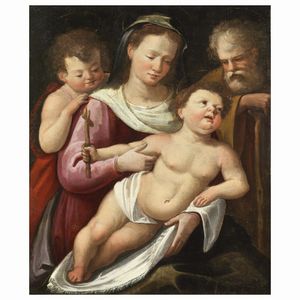 Scuola toscana, sec. XVI SACRA FAMIGLIA CON SAN GIOVANNINO olio su tavola, cm 64x52 Tuscan school, 16th century [..]