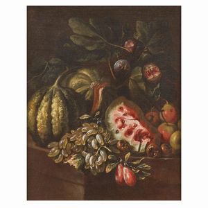 Scuola romana, sec. XVII NATURA MORTA CON ANGURIA E MELONI olio su tela, cm 74x59 Roman school, 17th century [..]