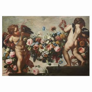 Franz Werner Tamm, detto Daprait (Amburgo 1658 Vienna 1724) e Scuola di Carlo Maratta FESTONE DI FIORI SORRETTO [..]