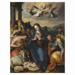 Scuola toscana, sec. XVII ADORAZIONE DEI PASTORI olio su tavola, cm 99x74,5 Tuscan school, 17th century THE [..]