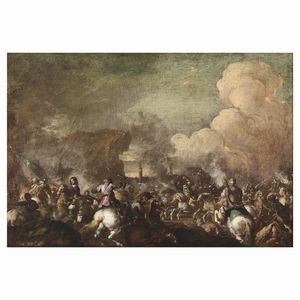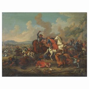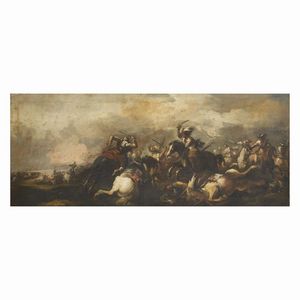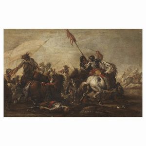 Artista nordico attivo in Italia, fine sec. XVII SCENA DI BATTAGLIA TRA CAVALLERIA E FANTI olio su tela, cm [..]