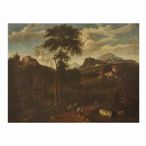 Artista nordico attivo a Roma, secc. XVII-XVIII PAESAGGI CON PERSONAGGI, ROVINE ED ARMENTI coppia di dipinti [..]