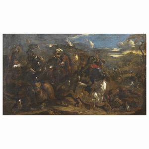 Artista emiliano, inizio sec. XVII SCENA DI BATTAGLIA olio su tela, cm 142x209 Emilian painter, early 17th [..]