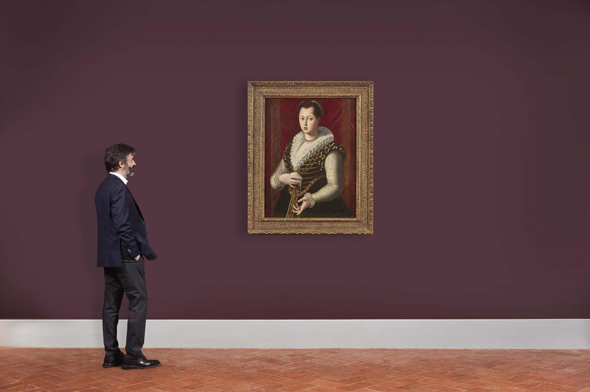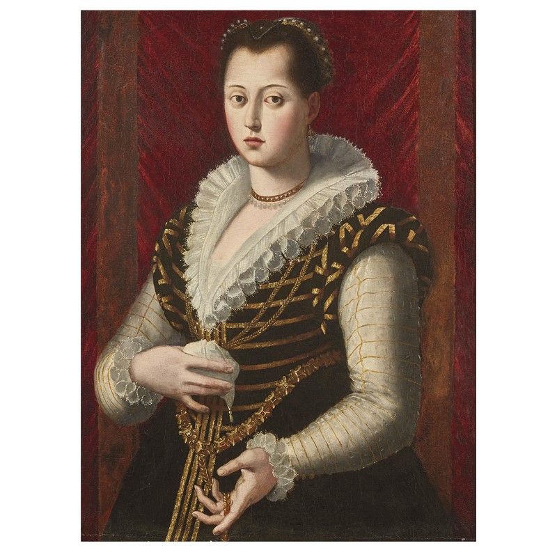 Il dipinto eseguito su supporto ligneo qui presentato è un bell’esempio di come venivano eseguiti i ritratti a Firenze intorno alla metà del XVI secolo nel periodo del “secondo manierismo, quando i tratti caratterizzanti di questo stile si plasmarono verso forme esecutive meno accentuate. Protagonista indiscusso di questo periodo fu il pittore Alessandro Allori, (Firenze 1549-1605), figlio adottivo di Agnolo di Cosimo dei Tori detto il Bronzino, Firenze, (Firenze 1503-1572), con il quale ebbe numerose collaborazioni lavorative e dal quale ereditò con merito, sia la bottega artistica che il soprannome. Ed è alla stretta cerchia di questo importante Maestro che proponiamo di ascrivere questo nobile ritratto di Isabella de’Medici. Isabella Romola de’Medici, nata a Firenze nel 1542 e figlia prediletta di Cosimo I granduca di Toscana e di Eleonora di Toledo, lasciò un gran vuoto al momento della prematura scomparsa, alimentando i sospetti che la sua morte fosse frutto di un crimine. Di bellezza fuori del comune, Isabella fu una delle donne più colte del suo tempo: conversava in spagnolo e francese, conosceva il latino e il greco antico, suonava con talento, componeva madrigali. Appena quattordicenne fu data in moglie a Paolo Giordano Orsini d’Aragona, erede di una dellefamiglie più potenti dello Stato Pontificio.Sempre al fianco del padre nelle apparizioni pubbliche e negli impegni istituzionali, Isabella de’ Medici si caratterizzò rapidamente come una figura di spicco nella diplomazia della Firenze medicea tra il 1565 e il 1575. Intelligente, arguta, brillante, attenta alle tendenze artistiche della Firenze del tempo, la duchessa animò il salotto culturale più alla moda in città, cui parteciparono letterati, poeti, musicisti e aristocratici. I contemporanei la raffigurarono come Caterina d’Alessandria e la paragonarono a Minerva, e numerosissime furono le opere a lei dedicate, in cui spesso, al di là dell’evidente desiderio di compiacere, si intuisce la genuina ammirazione per la destinataria. Figlia del Rinascimento più colto e raffinato, Isabella incoraggiò anche nuovi talenti, primo fra tutti quello di Maddalena Mezari, detta “la Casulana”, celebre madrigalista del Cinquecento. Quando Isabella trovò la morte, il 16 luglio del 1576 nella villa medicea di Cerreto Guidi, la notizia della sua inattesa scomparsa si diffuse ben presto in tutta Europa, alimentando l’ipotesi dell’omicidio per mano del marito accecato dalla gelosia per un suo presunto tradimento, tesi oggi smentita da prove documentali, dalle quali è stato dedotto che la giovane nobildonna trovò la morte dopo una lunga malattia.