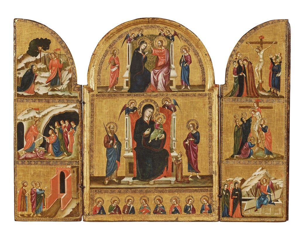 Il Trittico a fondo oro con sportelli laterali mobili qui proposto è un esempio dell’operato del Falsario di Edimburgo, che ipoteticamente e presumibilmente operò a Siena nella scia di Icilio Federico Joni (Siena 1866-1946). Tale attribuzione è evidenziata in maniera chiara dalla pubblicazione (relativa alla tavola in questione) a cura di Gianni Mazzoni, “Quadri antichi del Novecento”, edizioni Neri Pozza, Vicenza 2001, collana I Colibri, fig 203,pag 442, che mette in relazione la “nostra opera“ con quella di quasi analogo soggetto, ma con una disposizione spaziale diversa, concernete le rappresentazioni delle storie della vita di Gesù, acquistata nel 1943 sul mercato londinese dalla National Gallery of Scotland di Edimburgo ed ancora ivi presente. Si tratta quindi, nel contesto, di un curioso e importante ritrovamento che meglio delinea la figura di questo artista/ falsario, emulo della pittura primitiva senese in particolare di quella legata alla matrice Duccesca. La parte centrale di questo Fondoro di generose dimensioni, eseguito in maniera stilisticamente un po’ eclettica e fantasiosa , rispetto ai canoni dello Joni, è legata fortemente dal punto di vista iconografico e artistico, al Tabernacolo n.35 eseguito da un seguace di Duccio di Buoninsegna esposto nella Pinacoteca Nazionale di Siena.