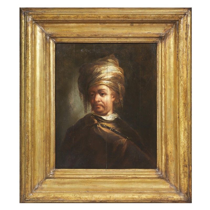 L’elegante ed esotico costume indossato dal personaggio effigiato sulla tavola offerta inserisce quest’opera nella moda di farsi ritrarre in abiti orientali portata in auge nel Seicento da Rembrandt, i cui maestosi personaggi con vistosi turbanti erano piuttosto richiesti sul mercato. Si pensi al Ritratto di personaggio orientale (noto come “Il nobile slavo”), firmato e datato 1632, conservato presso il Metropolitan Museum, dove l’artista nato a Leida ha vestito con maestoso turbante, prezioso mantello e ricchi monili probabilmente un suo connazionale. Non si tratta infatti in questo come in altre sue realizzazioni di veri personaggi orientali ma di pseudo ritratti di suggestive figure esotiche per i quali fungevano da modelli connazionali abbigliati per l’occasione e in atteggiamento solenne.