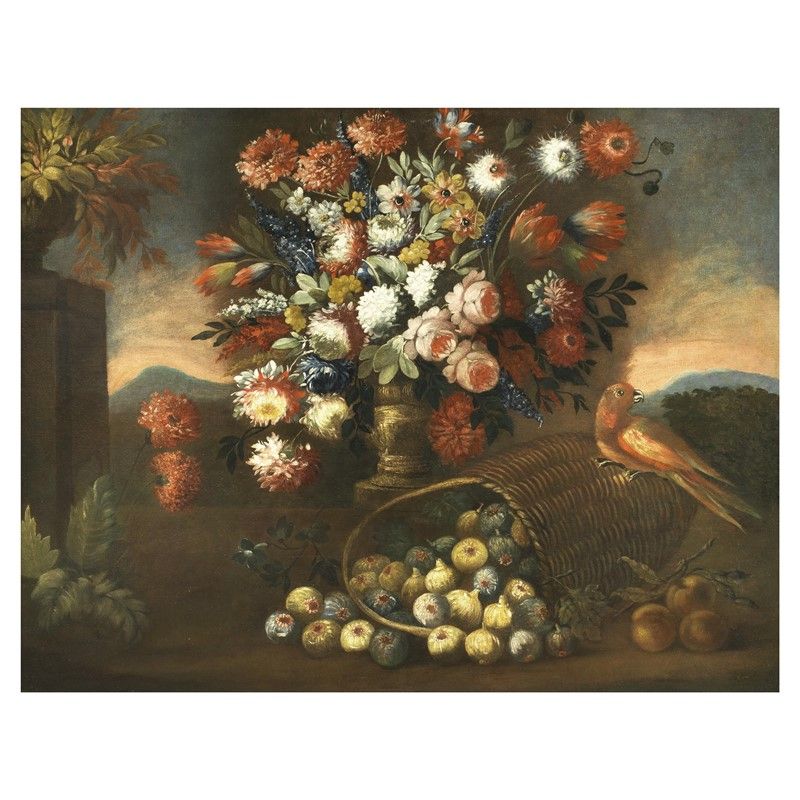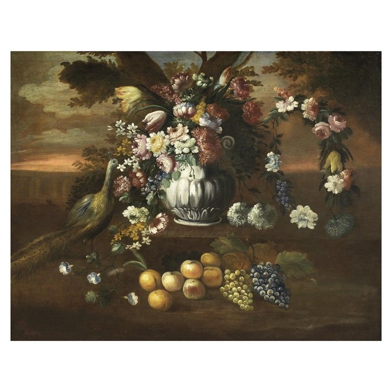 VASI DI FIORI ALL'APERTO CON PAVONE E PAPPAGALLO