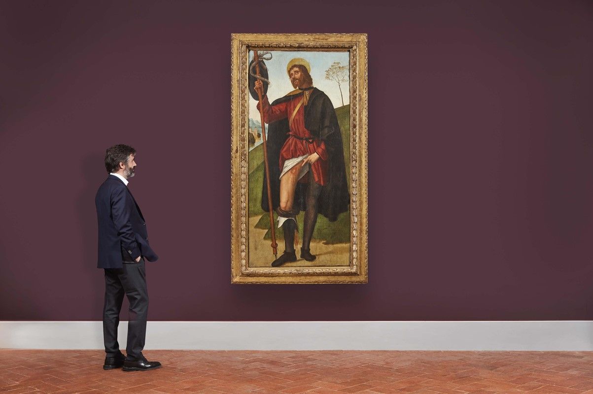 L’opera qui proposta raffigura San Rocco, pellegrino francese venerato soprattutto come protettore dalle malattie gode ancora oggi di una grande popolarità. Raffigurato con abiti da pellegrino: bastone, cappello e una borraccia partì per un lungo cammino a seguito della morte di entrambi i genitori. Il viaggio iniziò probabilmente dalla sua città natale di Montpellier per arrivare fino a Roma attraversando la Liguria e la Toscana nel periodo della pestilenza tra il 1367 e il 1368 dove si apprestò a dare soccorso agli ammorbati; le agiografie parlano di un suo passaggio a Lucca, Firenze e Siena.