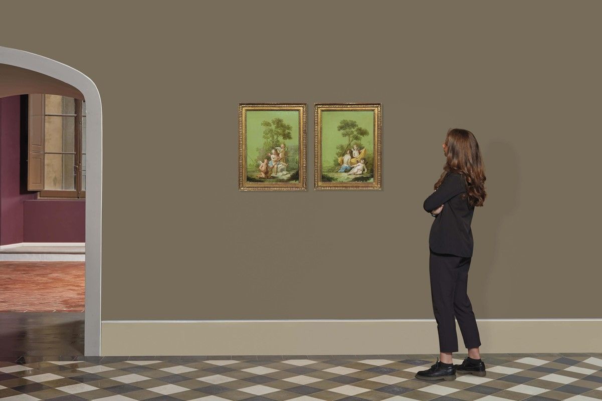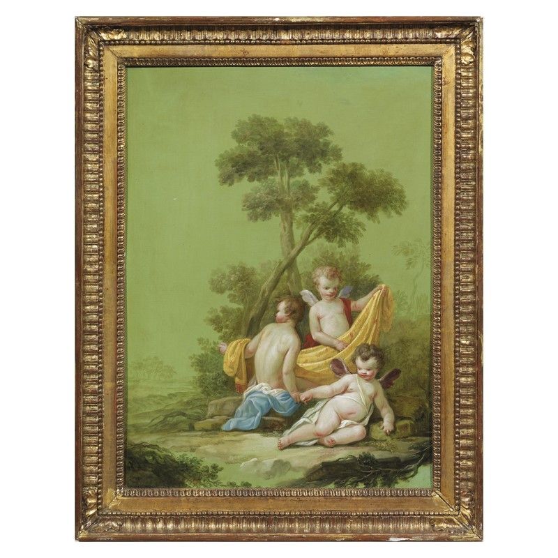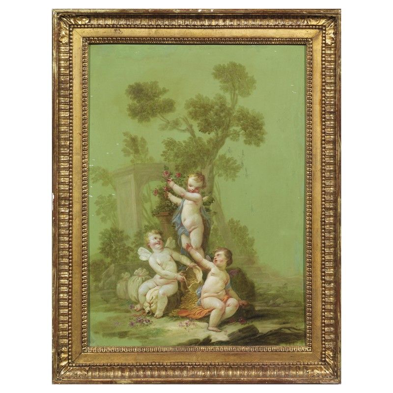 French school, 18th century ALLEGORY OF MUSIC PLAYING PUTTI ALLEGORY OF GEOGRAPHY ALLEGORY OF WELLNESS four paintings, oil on panel, cm 47x32 (2)