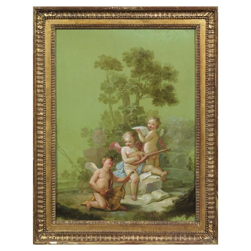 Scuola francese, sec. XVIII ALLEGORIA DELLA MUSICA ALLEGORIA DELLA GEOGRAFIA ALLEGORIA DELLA RICCHEZZA PUTTI GIOCOSI serie di quattro dipinti, olio su tavola, cm 47x32 (4)
