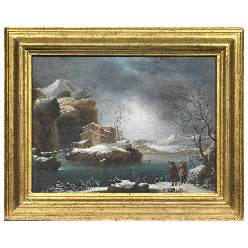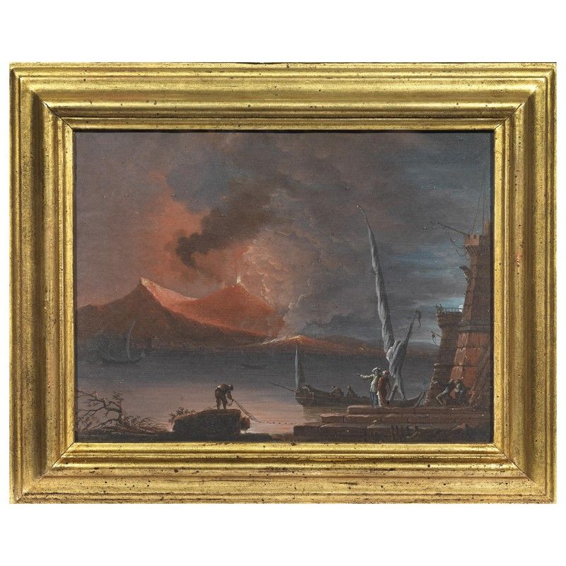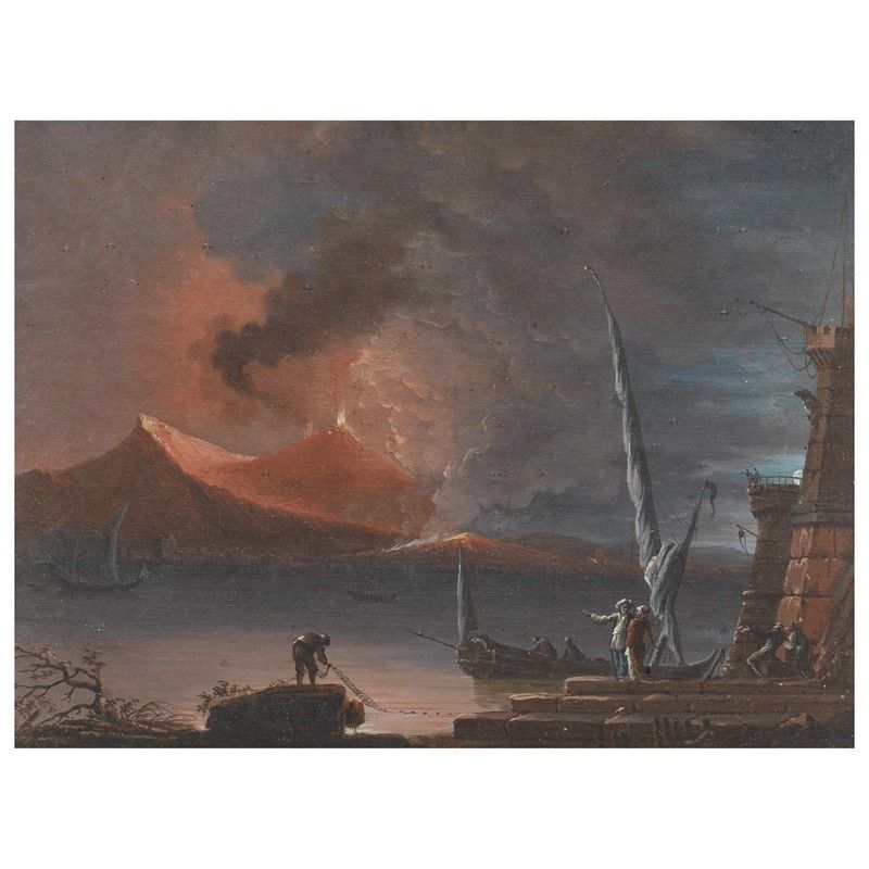 Roman school, 18th century SEA VIEW WITH A LANDASCAPE COVERED WITH SNOW SEA VIEW WITH A VOLCANO oil on paper laid down on canvas, cm 20,5x26 a pair (2)