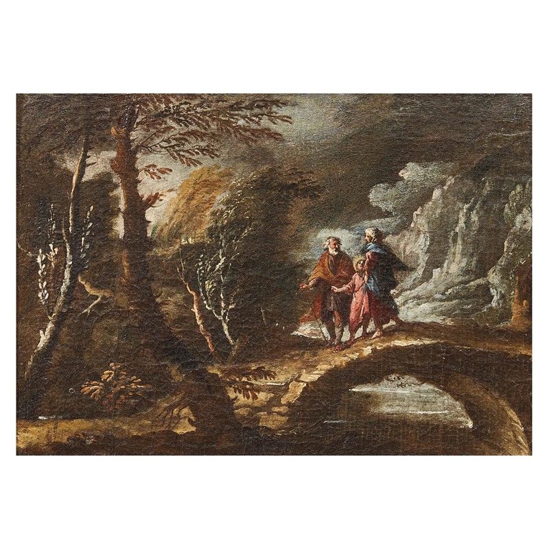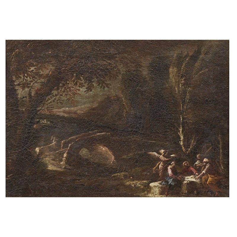 Venetian school, 17th century LANDSCAPE WITH THE FLIGHT INTO EGYPT LANDSCAPE WITH THE RETURN FROM EGYPT LANDSCAPE WITH TOBIOLO AND THE ANGEL LANDSCAPE WITH CONVIVIAL SCENE four paintings, oil on canvas, cm 22x29 (4)