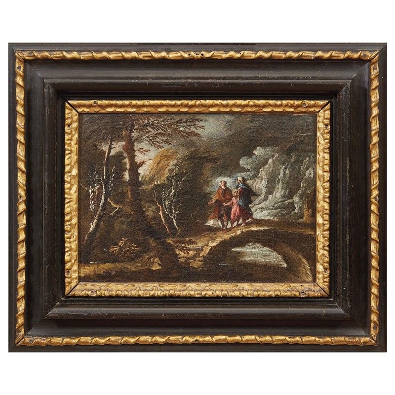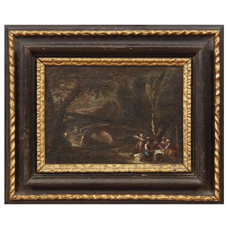 Scuola veneta, sec. XVII PAESAGGIO CON FUGA IN EGITTO PEASAGGIO CON RITORNO DALL'EGITTO PAESAGGIO CON TOBIOLO E L'ANGELO PAESAGGIO CON SCENA CONVIVIALE serie di quattro dipinti, olio su tela, cm 22x29 (4)