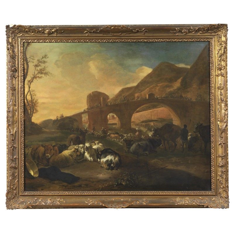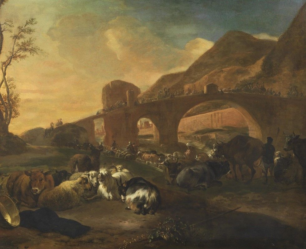 A LANDSCAPE WITH HERDS AND A BRIDGE ON THE BACKGROUND