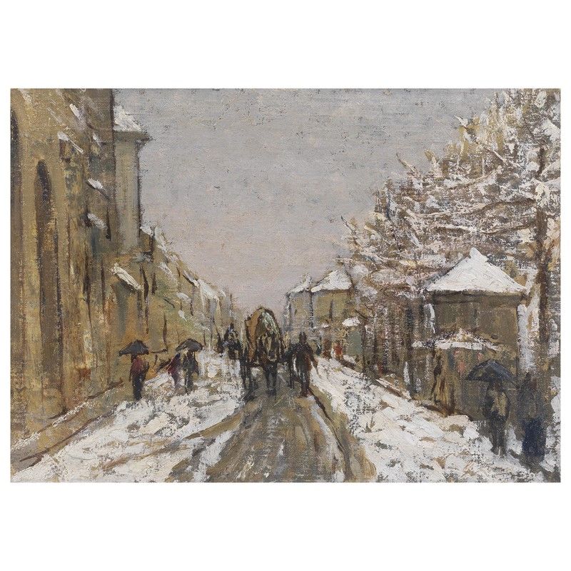 Giovanni Lomi (Livorno 1889 - 1969) BIELLA SOTTO LA NEVE olio su tela applicata su cartone, cm 22,5x32 firmato in basso a destra retro: titolato, cartiglio della Galleria Guglielmi di Milano