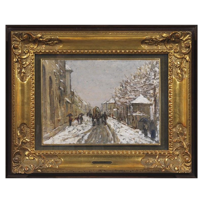 BIELLA UNDER THE SNOW oil on canvas, laid down on cardboard, 22.5x32 cm signed lower right on the reverse: titled, label of Galleria Guglielmi in Milan