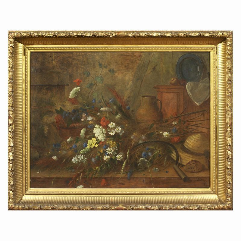 Narcisse Rabier (Briou 1829 - Orléans 1919) NATURA MORTA CON FIORI DI CAMPO E CAPPELLO DI PAGLIA olio su tela, cm 92x120 firmato e datato 86 in basso a destra
