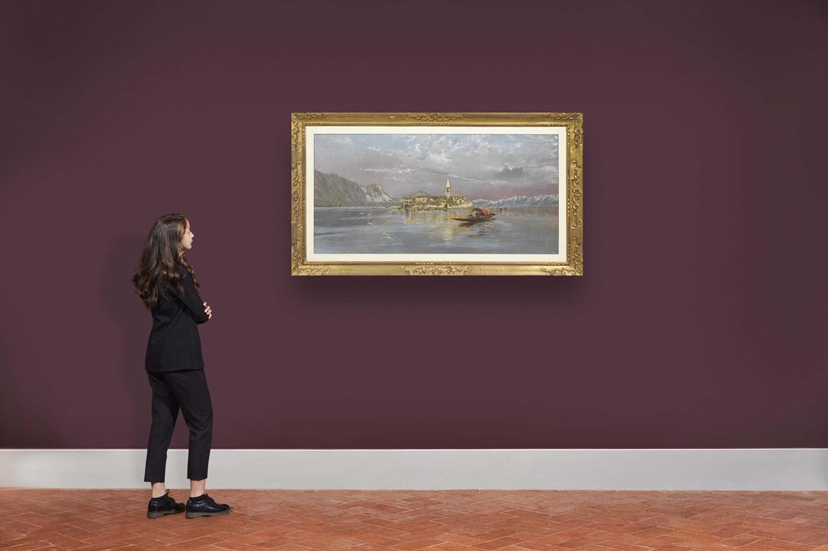 Riccardo Pellegrini (Milano 1863 - Crescenzago 1934) ISOLA DEI PESCATORI, LAGO MAGGIORE olio su tela, cm 64,5x120 retro: dichiarazione di autenticità a firma della moglie dell'artista datata “14 Luglio 1916”